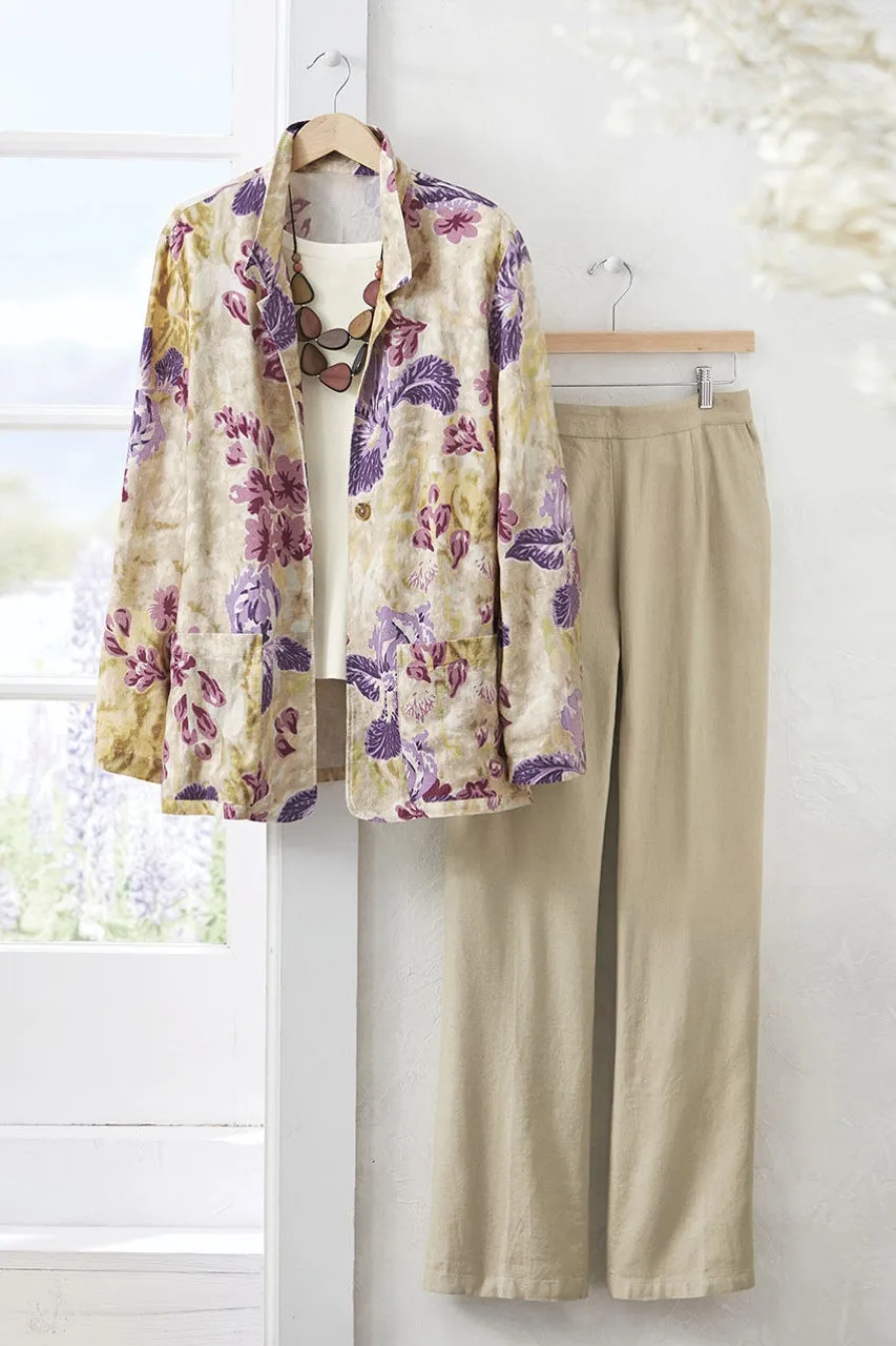 Pure style inspiration in an iris floral print. Our lightweight jacket feels natural yet smooth in a linen/viscose blend, with a single button closure and front patch pockets. Unstructured and easy, it offers more drape than a traditional blazer. Roll the cuffs back for a more casual look.
