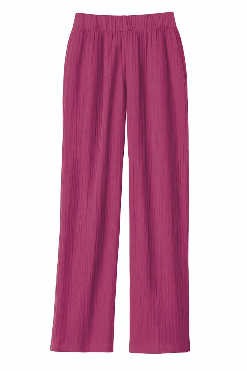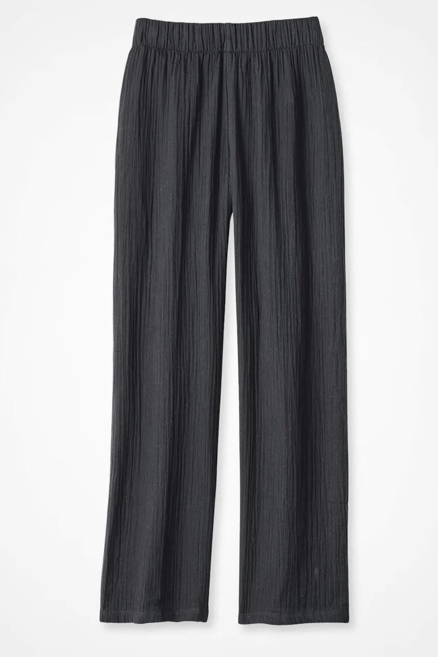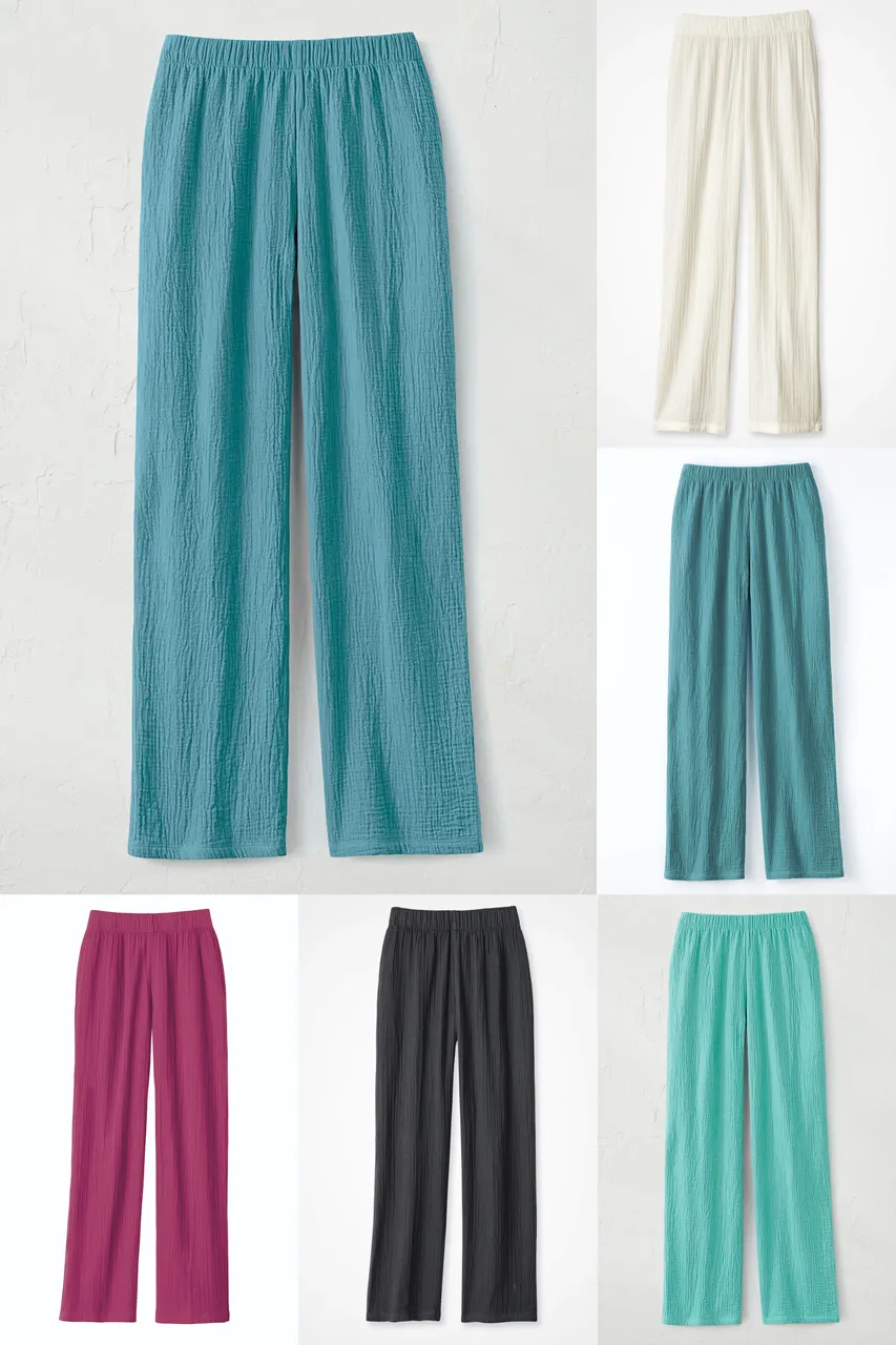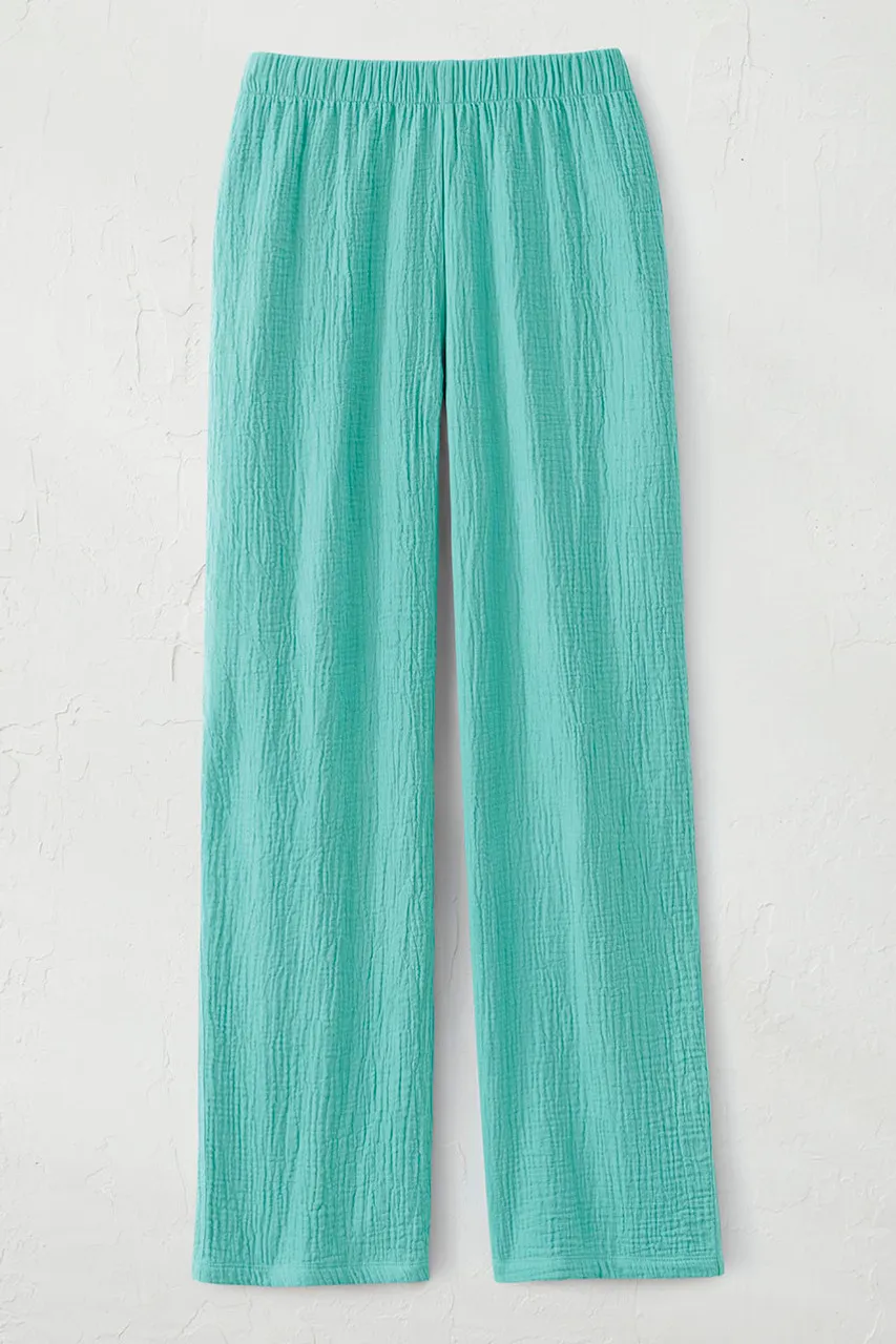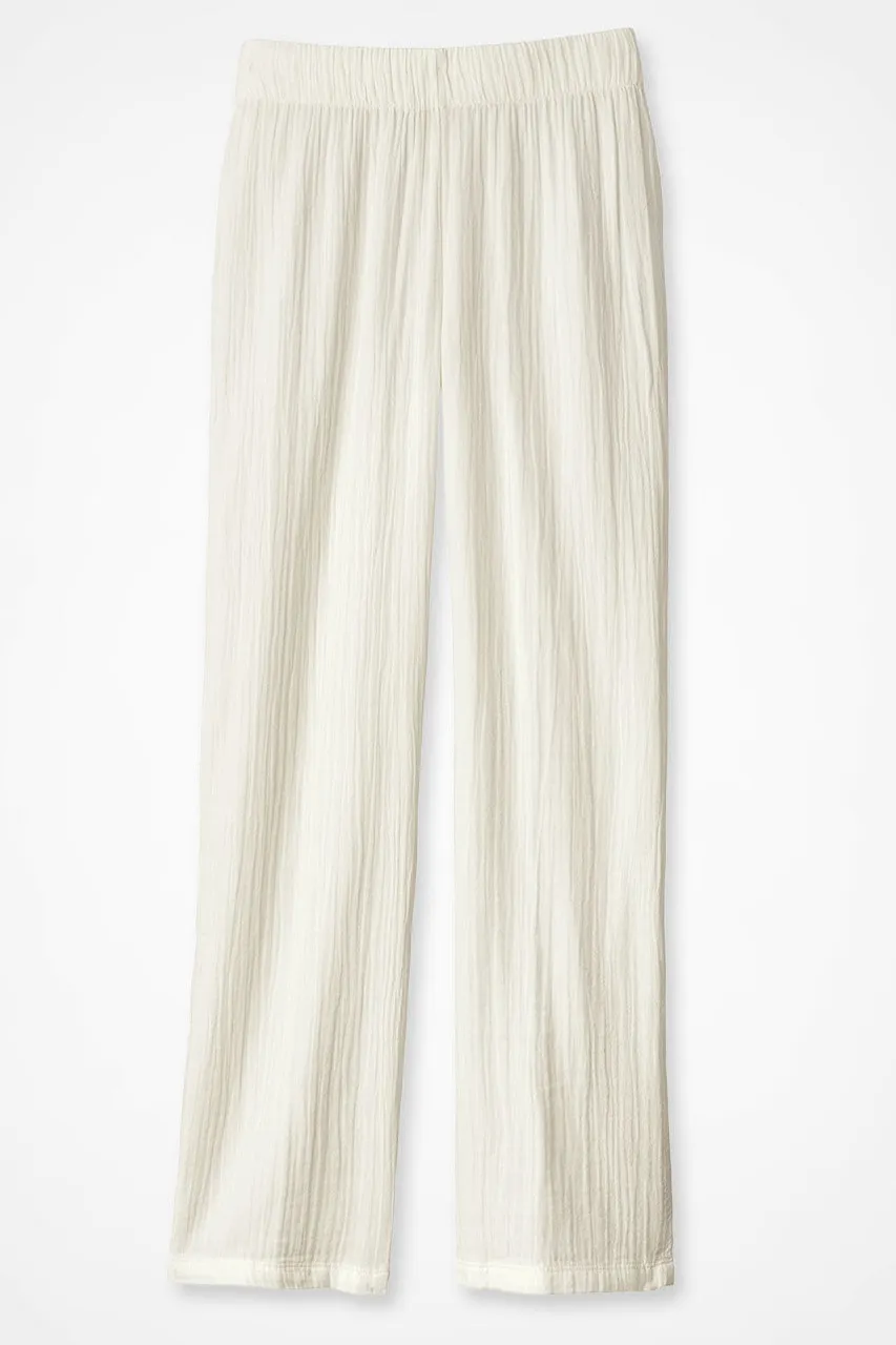 These pants really do make summer a breeze. They’re light, easy and versatile in crinkled cotton gauze, with a full elastic waist. Imported.