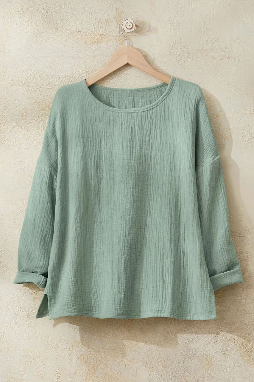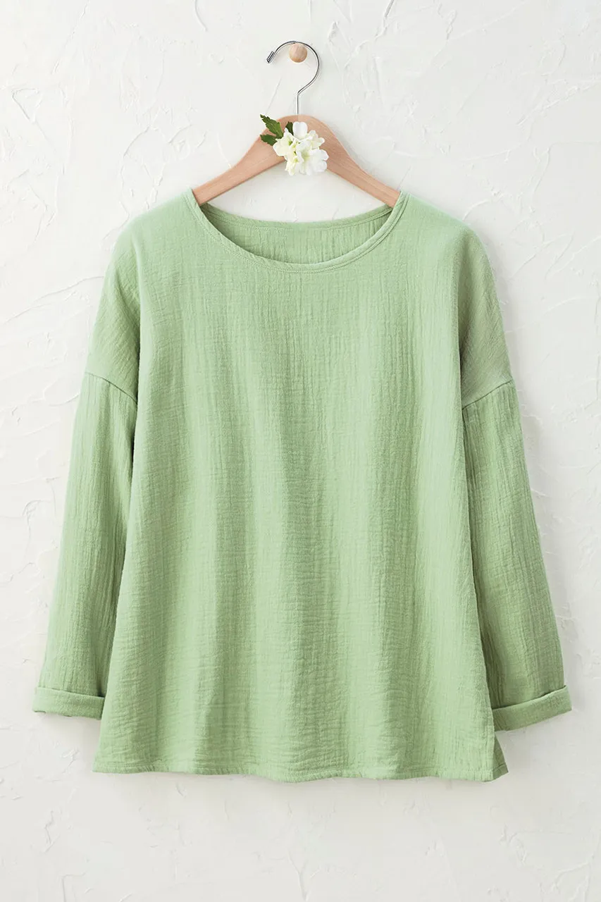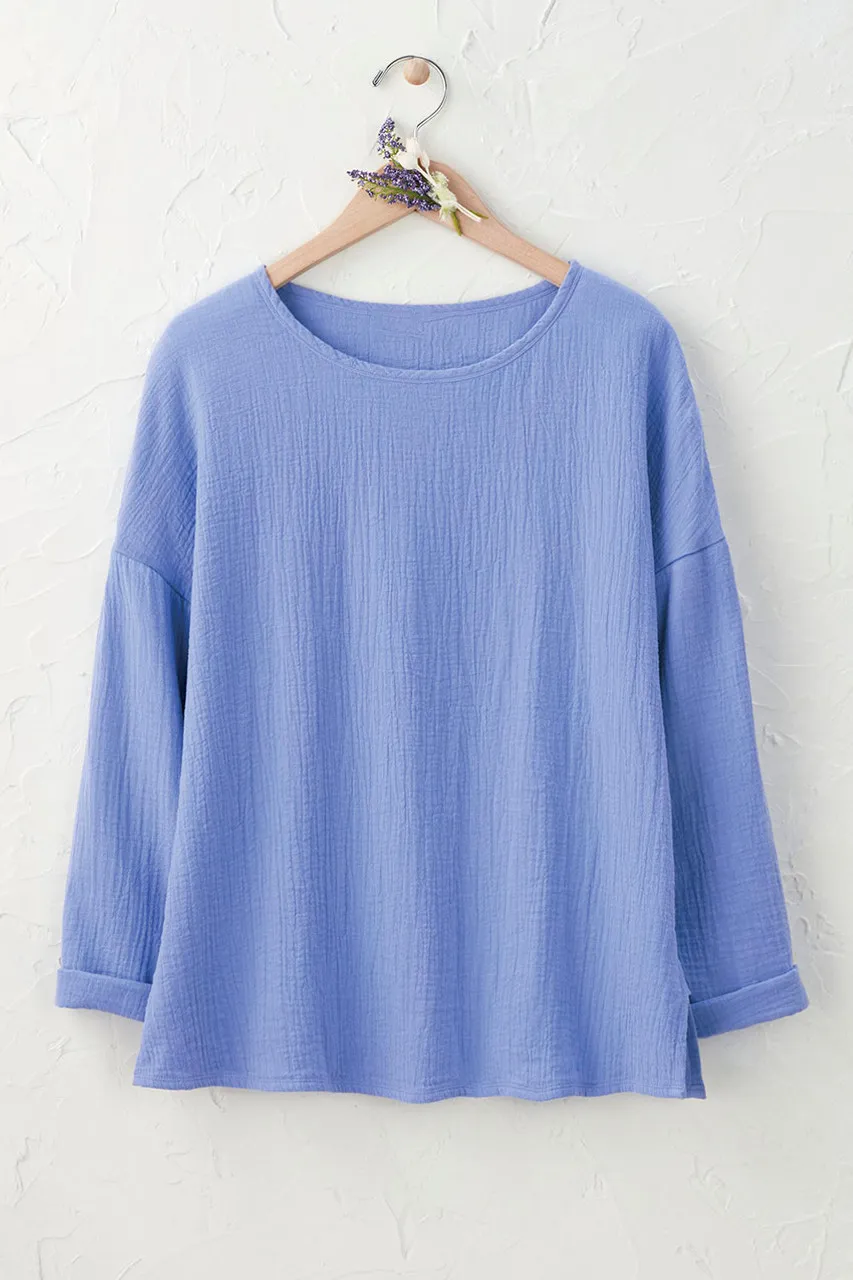 Light and easy in a simple pullover style of softly crinkled gauze. Dropped shoulders and side slits.