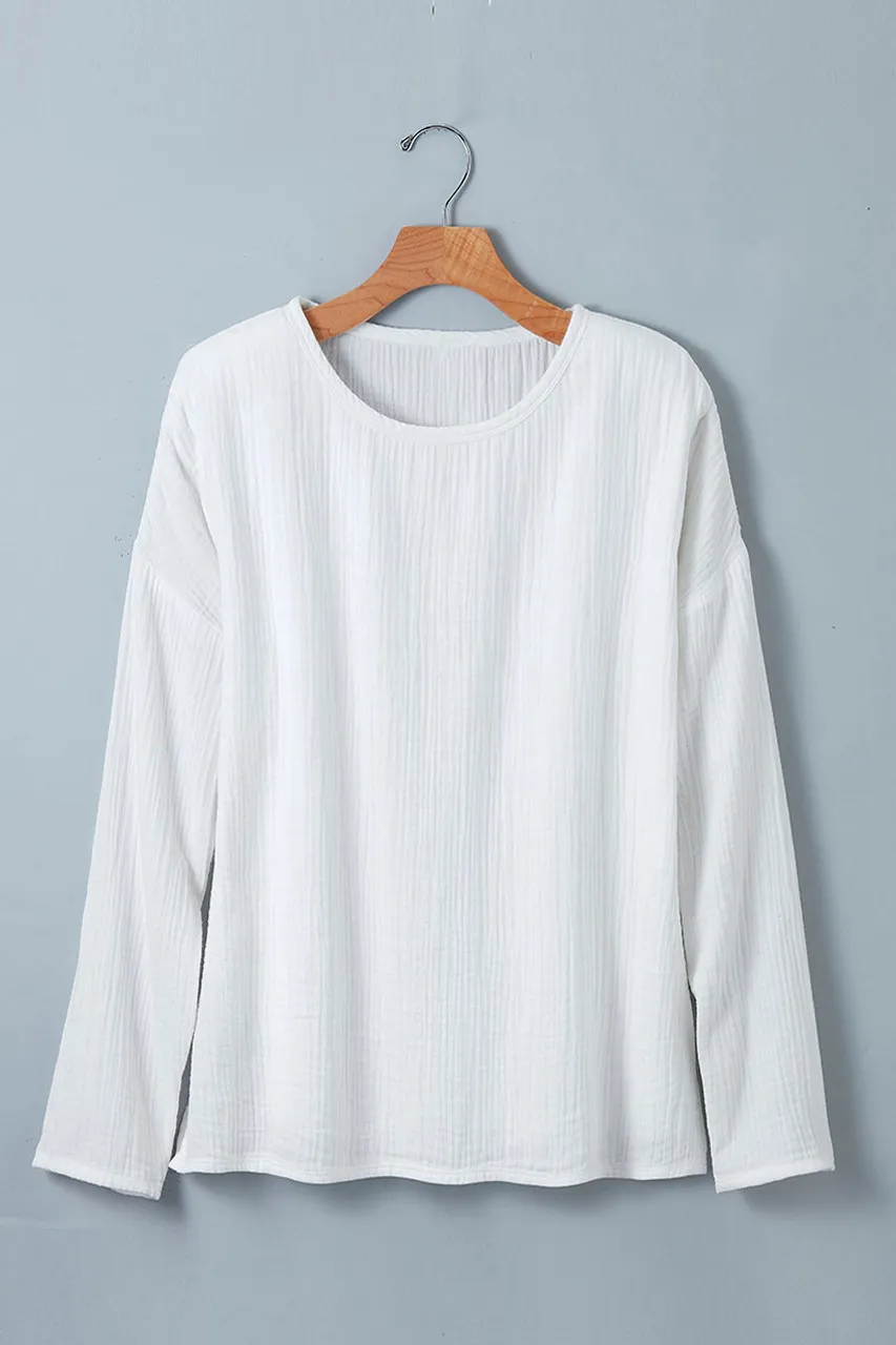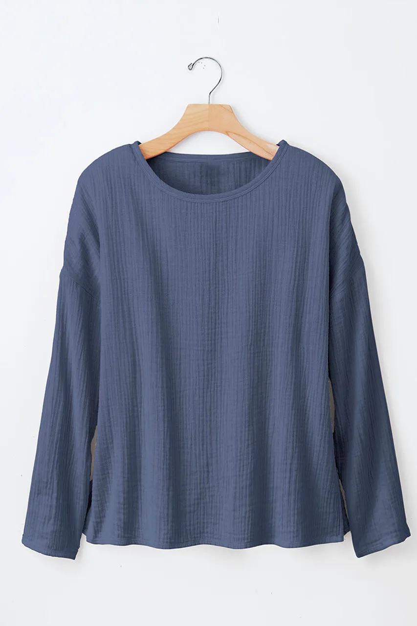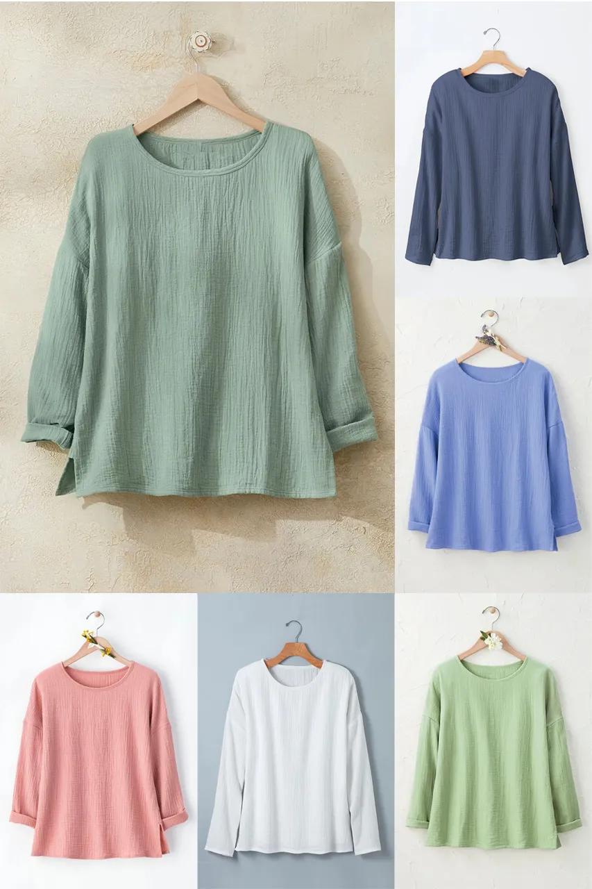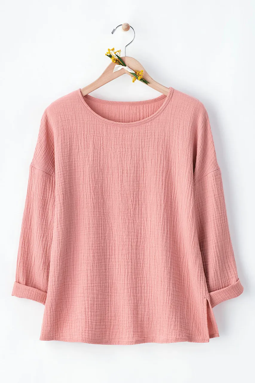Light and easy in a simple pullover style of softly crinkled gauze. Dropped shoulders and side slits.