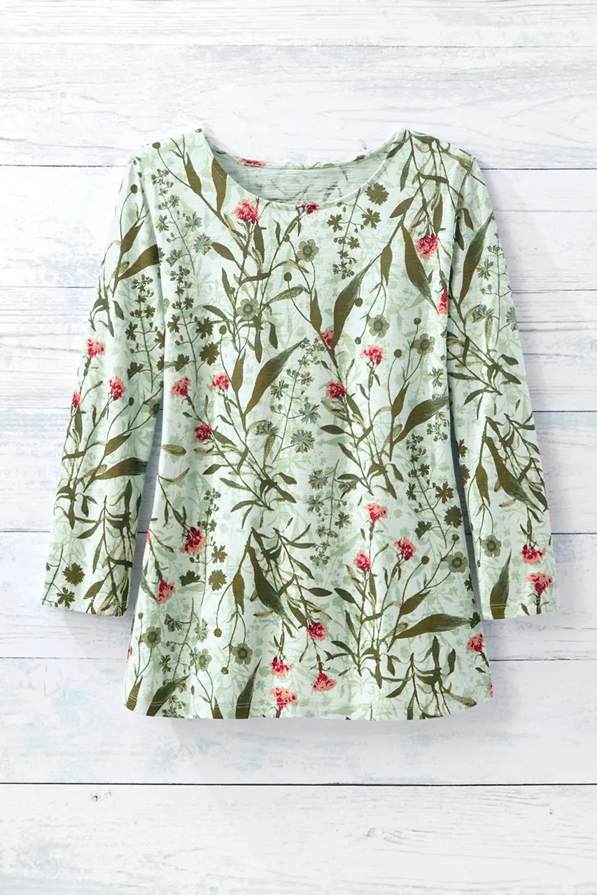 A slub knit favorite, inspired for a new season in a delicate green botanical print and rounded hem.