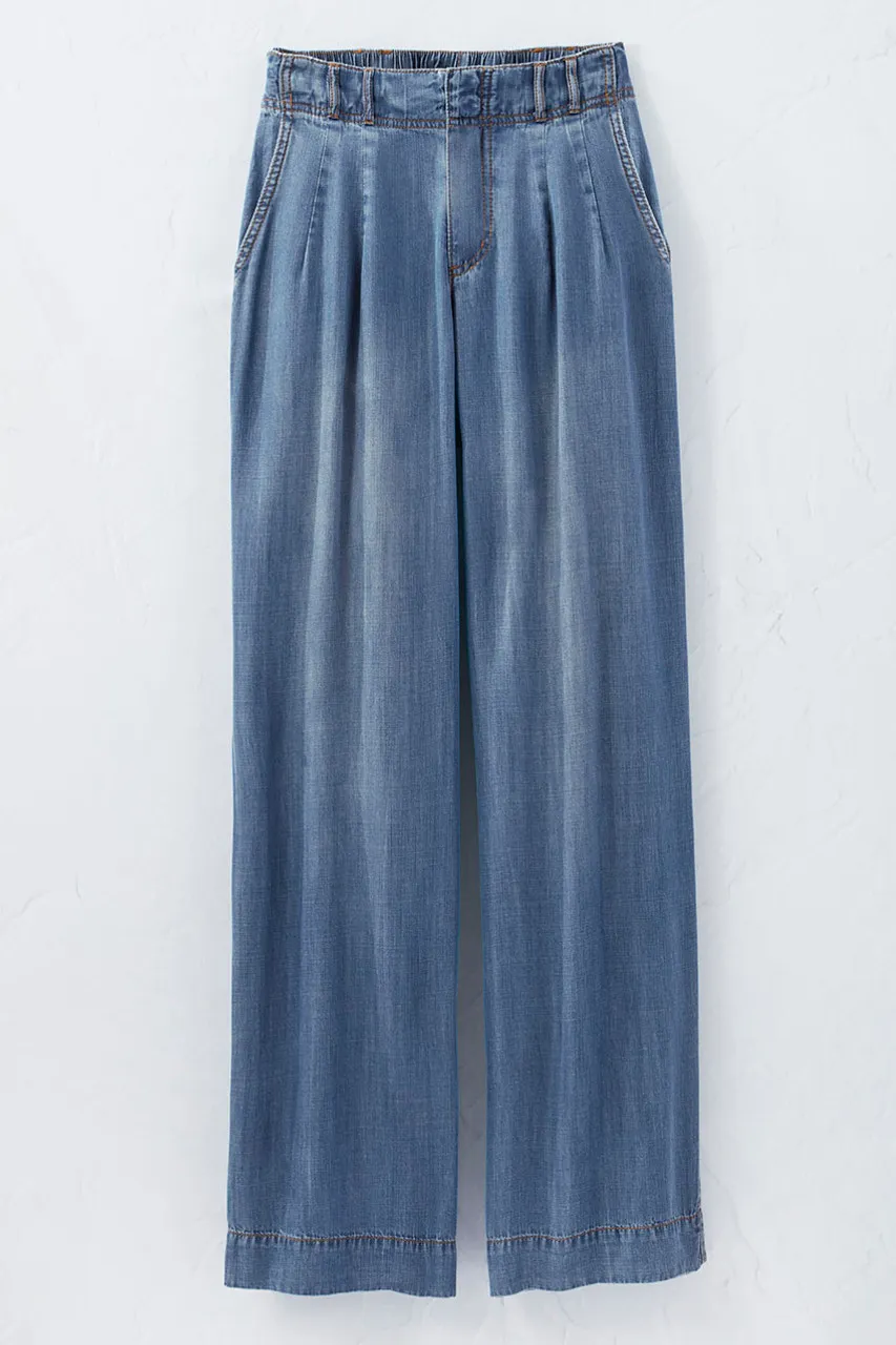 A best-selling silhouette, now in refined, lightweight denim with effortless drape. Fly front, with back elastic waist and belt loops. Front darts and slant pockets.