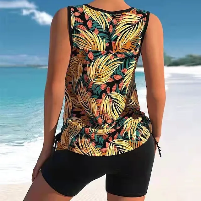• Women's Swimwear Tankini 2 Piece Plus Size Swimsuit Printing Floral Black White Yellow Pink Sky Blue Tank Top Bathing Suits Sports Summer