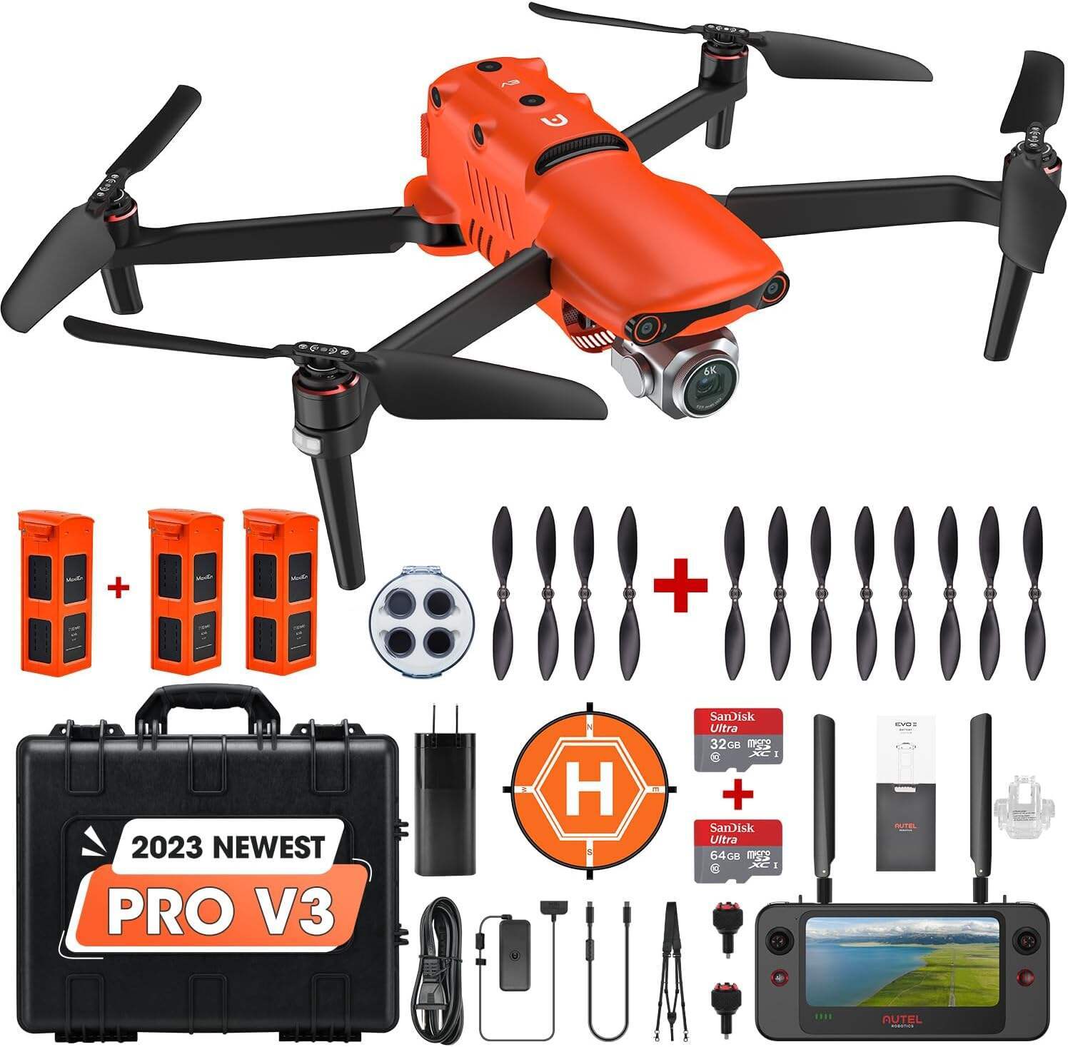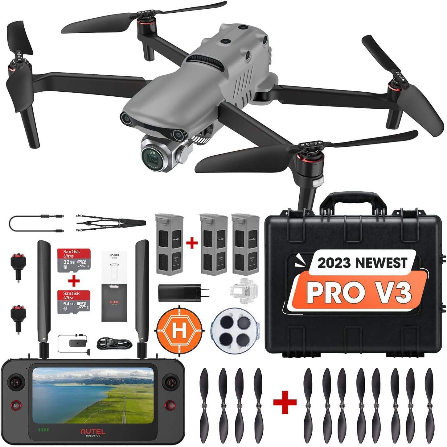 - 👍【THE EVO II PRO VERSION 3 COMBO INCLUDES】1* Ready-to-go EVO II pro 6K drone(1*Battery, 2 Pair * EVO 2 low noise propellers, 1* gimbal holder, 1* 32 G SD), 1* Remote Control, 2* extra battery, 4 pair * extra propellers, 1* extra 64 GB SD card, 1 pair *Spare Control Stick, 1* Custom Lens Wipe, 1 * Landing Pad, 1* Hard Carry Case, etc. This bundle is backed by 30 Days REPLACEMENT or FULL REFUND, 12 Months free from defects services. Any concerns or issues, please contact 📩immoautel @ outlook .com📩 directly.