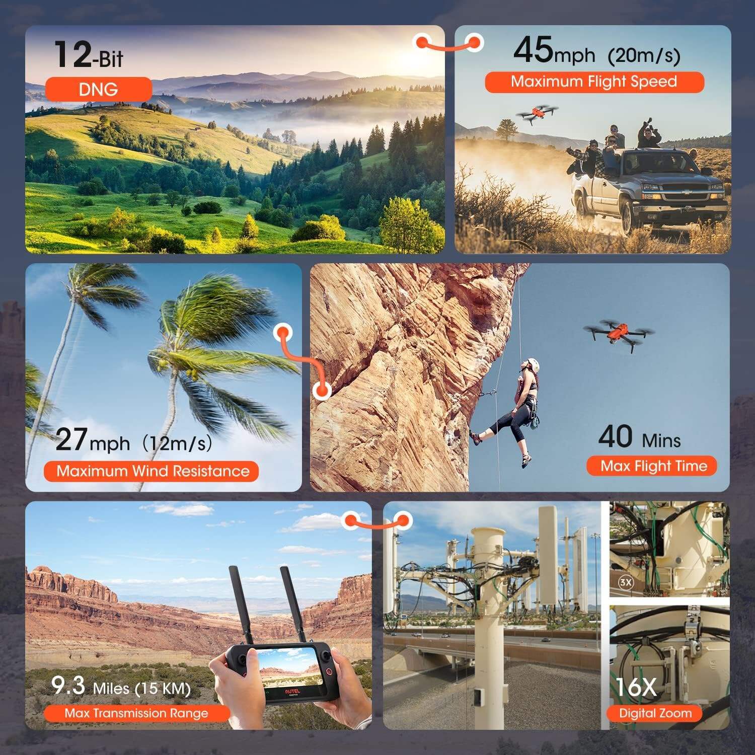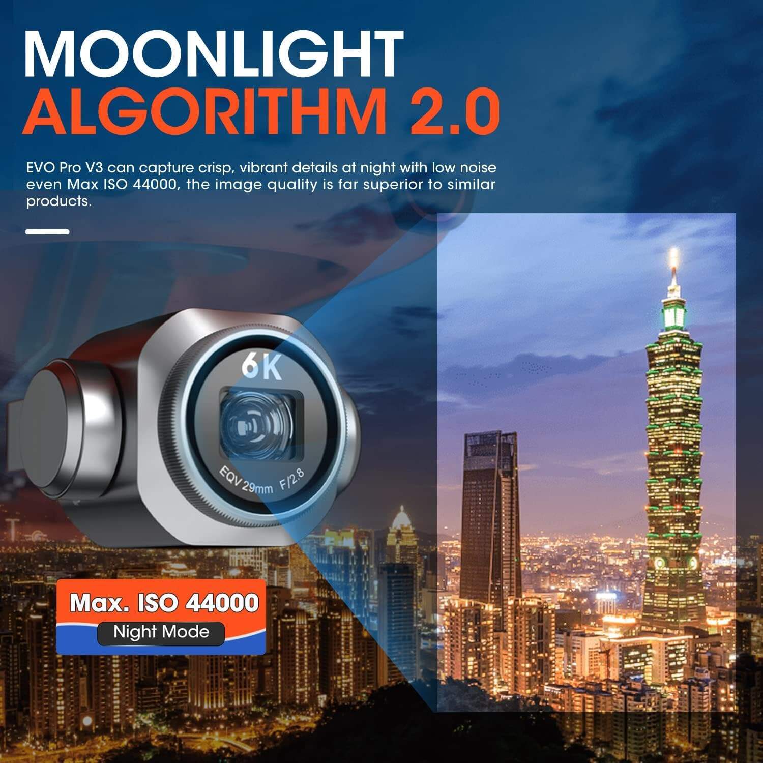 - 👍【MOONLIGHT ALGORITHM 2.0 & 4K HDR VIDEO】Autel EVO II Pro V3 comes with Autel's Moonlight Algorithm 2.0(Max ISO 44000), which provides additional noise reduction for improved image quality. Combined with its upgraded CMOS sensor, this drone is capable of capturing clear images and video even in low light conditions or at night. EVO II Pro V3 pairs the brilliance of 4K clarity with the brightness, color, and detail of HDR. Previously hidden areas of shadow and sunlight are now full of clarity and detail.