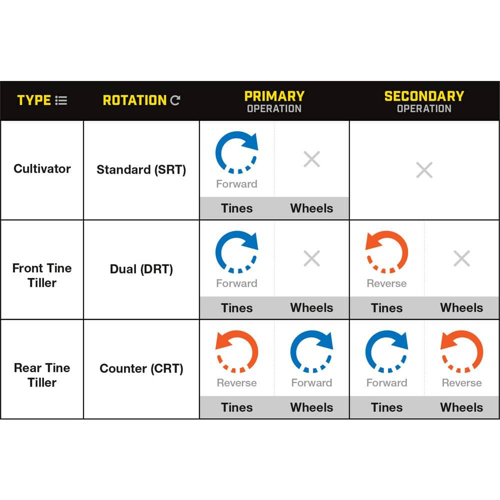 Dual rotating tine tillers very widely depending upon the specific type of tiller being discussed, the Champion DRT tiller see the tines rotate forward under standard operation but can also rotate in reverse for short periods of non-tilling activity (e.g. moving the tiller out of a difficult location).
