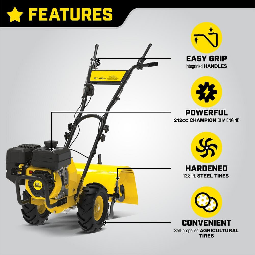 This indispensable machine features convenient handle controls and counter-rotation tilling, offering you the ultimate in versatility and performance. Even the most challenging ground is no match for the four 13.8-inch hardened steel tines and their efficient bidirectional shredding design.