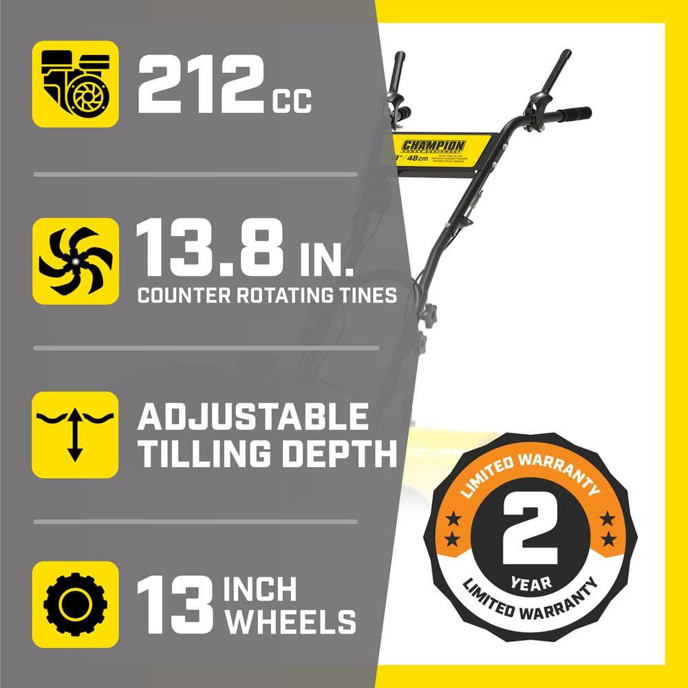 Four heavy-duty 13.8-inch hardened steel tines with counter-rotation tilling are designed to tackle the toughest soil conditions with the least amount of effort