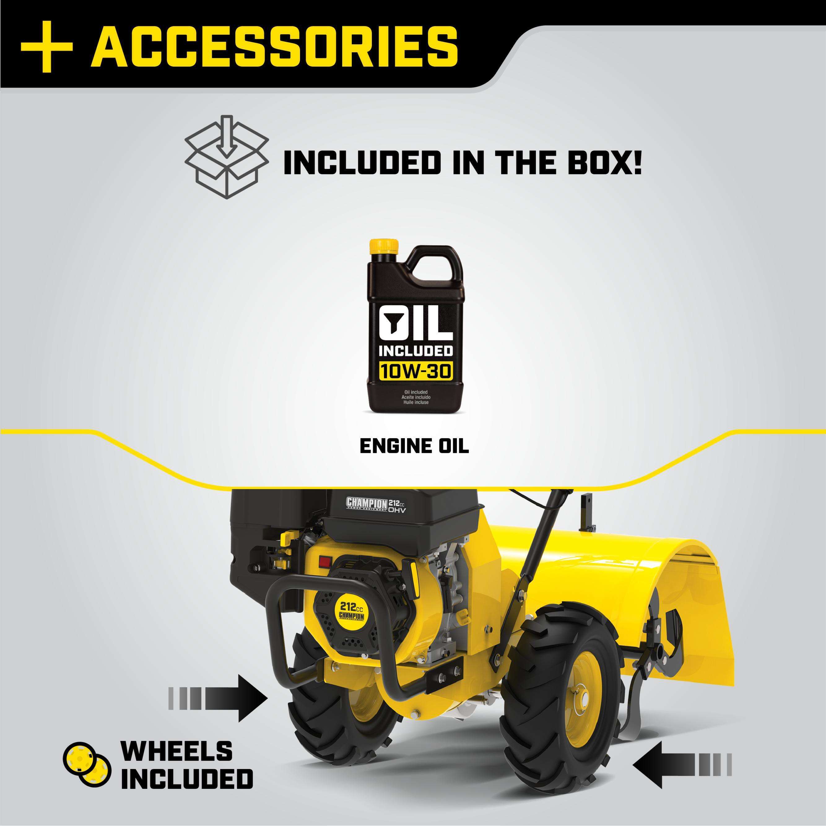 The 212cc engine powers a cast iron, gear-driven transmission housed in a heavy-duty cast-iron case. The transfer of power from the engine to the wheels enables this tiller to perform perfectly while tackling your largest landscaping and gardening jobs.