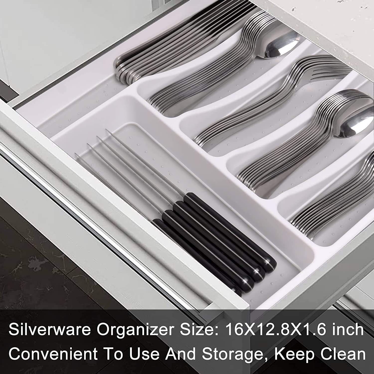- ④SILVERWARE DRAWER ORGANIZER: Made of high quality plastic, durable and resistant to deformation. Featured non-slip rubber feet makes cutlery organizer does not move in the drawer. And soft-grip lining fixes the tableware in the cutlery tray. The cutlery drawer organizer with 6 compartments, provide enough space for various sized items, ideal for silverware and various kitchen gadgets.