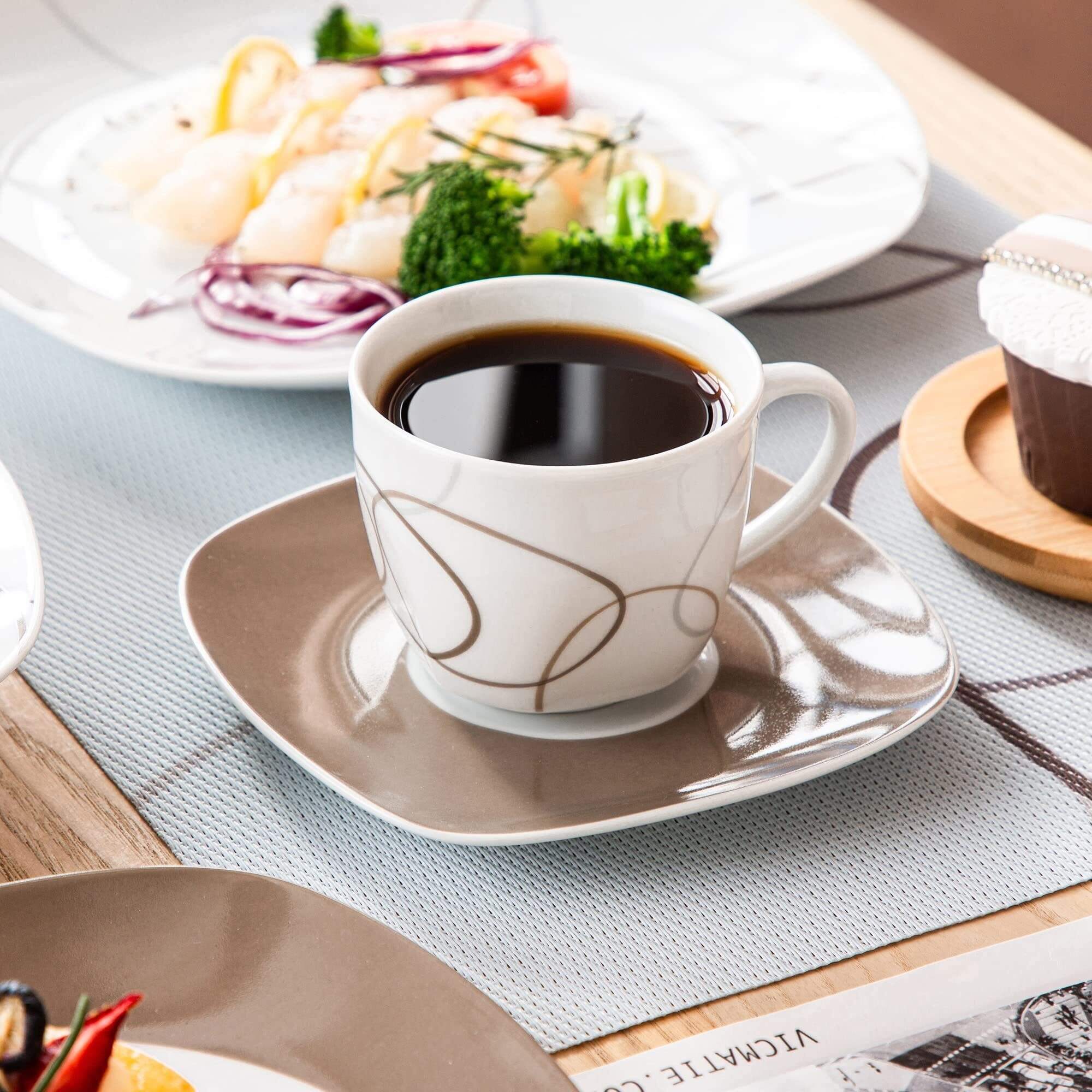 • DINNERWARE SETS FOR 6: 50-Piece porcelain dinnerware set service for 6 person, includes 8.8 oz sugar pot and 6.3 oz milk jug set, and 6 of each: 9.75 inch dinner plate, 7.5 inch dessert plate, 6.7 inch bowl, 8.5 inch soup plate,12.3 oz mug, 7 oz cup , 6 inch saucer , 1.85 inch egg cup, Tip: plan out the measurements on a ruler to give you an idea of its actual size before purchasing.