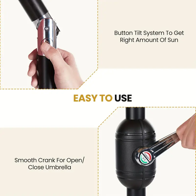 Enjoy effortless use with the umbrella’s convenient crank lift mechanism. Opening and closing the umbrella is a breeze, ensuring you can quickly provide shade whenever needed. The push-button tilt feature allows you to adjust the angle of the umbrella easily, ensuring optimal sun protection throughout the day. Stay cool and comfortable with minimal effort.
