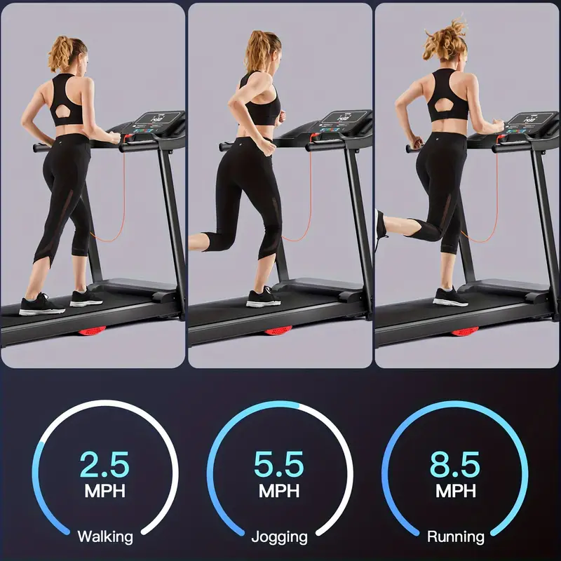 Quiet Brushless Motor: Powered by a brushless motor, our treadmill reaches a maximum speed of 8.5MPH while operating quietly at 45dB. This ensures a smooth workout experience, extending usability and minimizing maintenance costs.