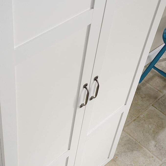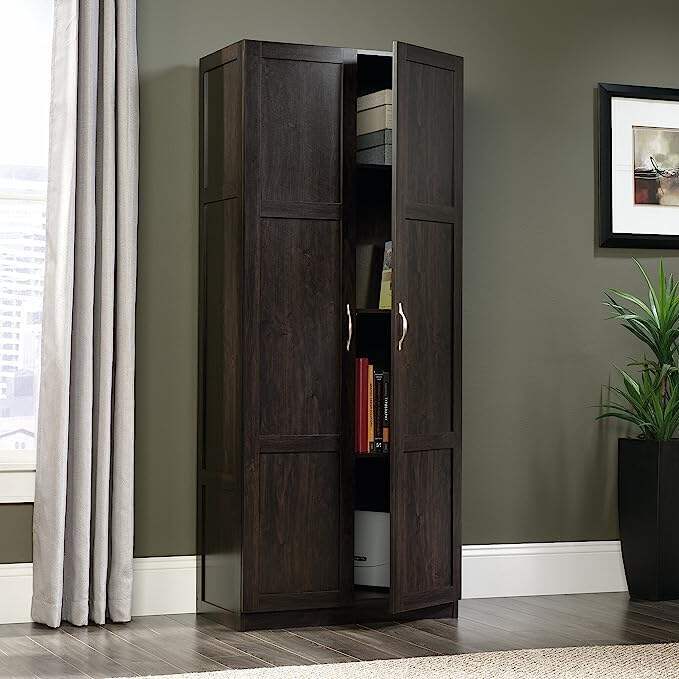 This double door storage cabinet offers the perfect amount of style and practicality for any room in your home. This durable storage cabinet has four adjustable shelves and a full-width upper shelf so you can stash books, totes, blankets, pantry items and more.