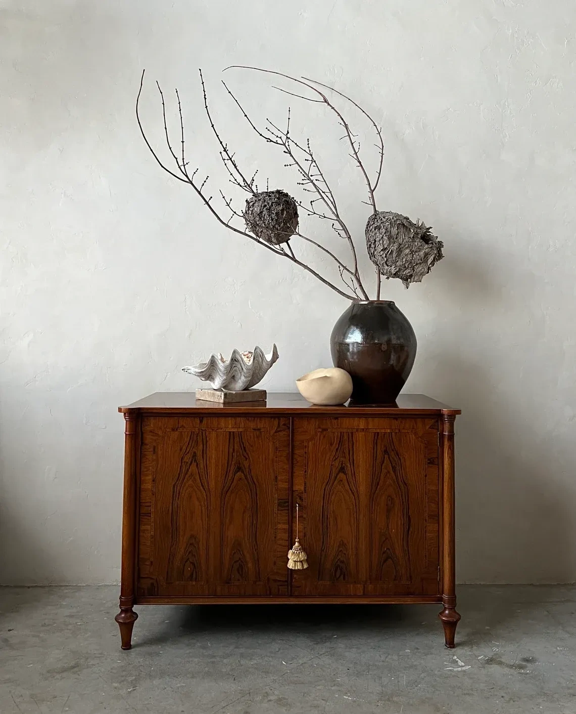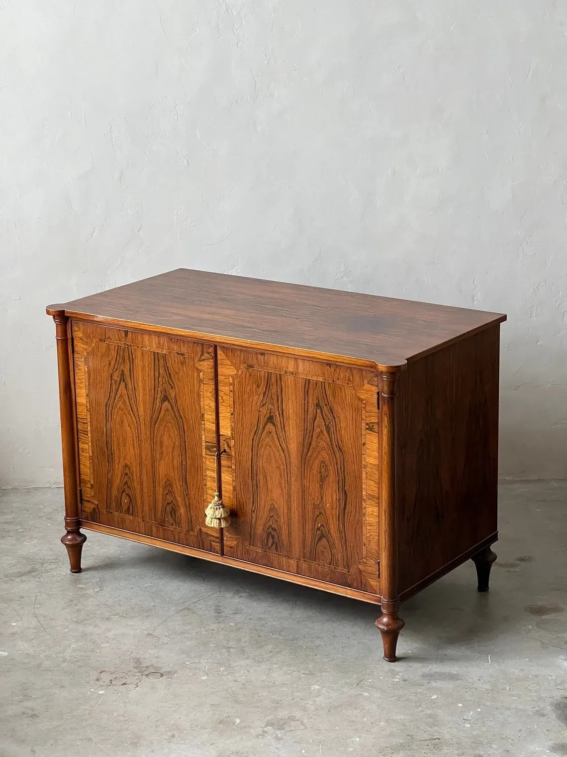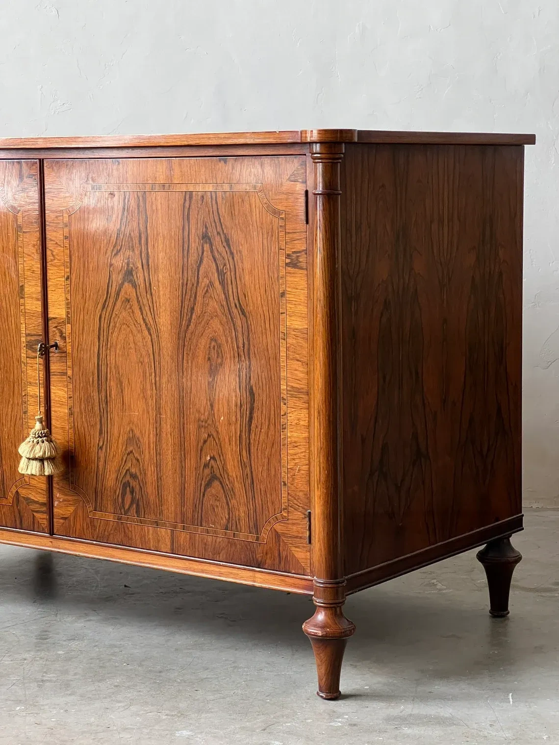 Mid 20th century sideboard of the English regency influence. Remarkable rosewood and inlaid veneer throughout. Very high quality craftsmanship. Interior has two sliding drawers and one sliding shelf.