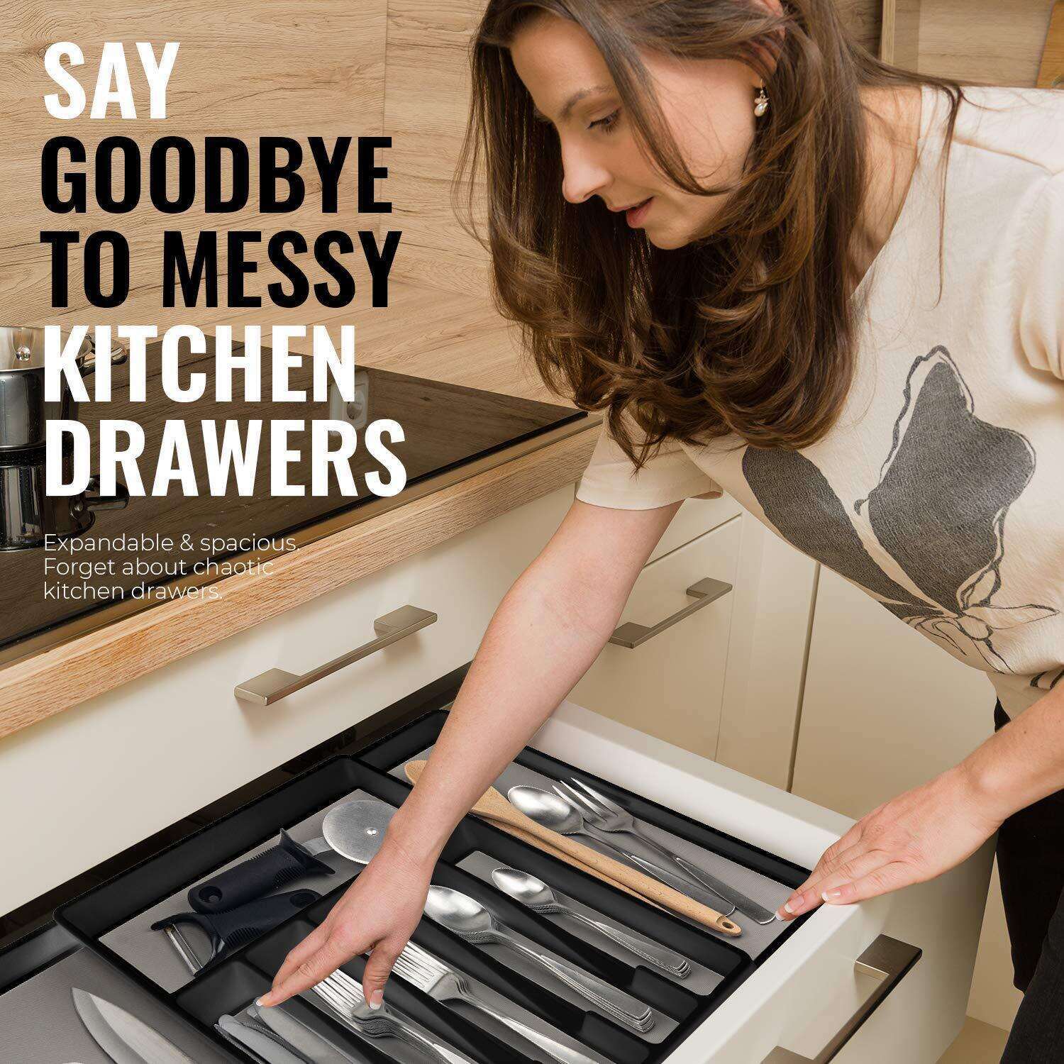- NO MORE MESSY KITCHEN DRAWERS: You can officially forget all about chaotic kitchen drawers and jumbled piles of silverware, cutlery, and cooking utensils. With this 2 piece expandable cutlery and utensil organizer tray set, every single one of your kitchen utensils and piece of flatware will have its own place, ensuring that your drawers can finally stay in perfect order!