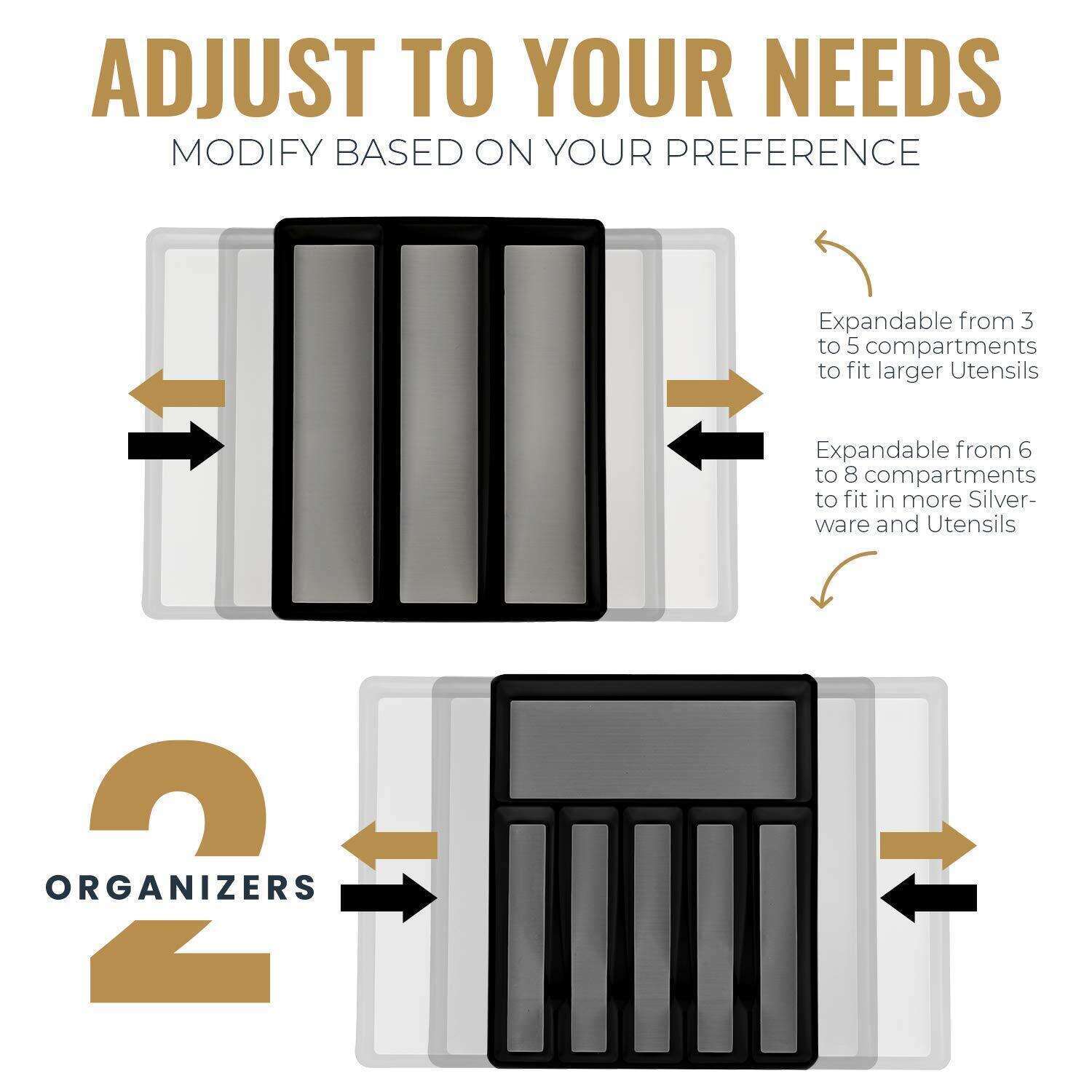 - ADJUSTABLE DESIGN TO PERFECTLY FIT *YOUR* NEEDS: Big, small, wide or narrow ¨C no matter what your drawer configuration looks like, with 2 separate, fully adjustable trays that expand according to your need, this set is practically guaranteed to fit the bill. The Cutlery Organizer has a total of 8 compartments [5 Small, 1 Medium, plus 2 Large on the side that can be used, if expanded]. The Utensil Organizer has a total of 5 Sections [3 Large sections when not expanded, and 2 more, if expanded.]