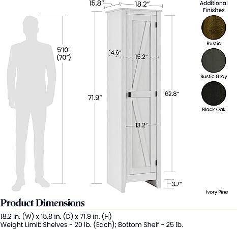 - Dimensions: 71.9”H x 18.2”W x 15.8”D