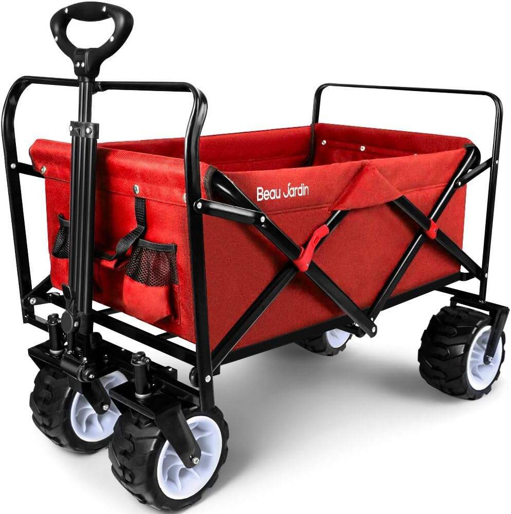 - Easy transport : sets up in seconds, no assembly required! Small enough to fit in closet, on the wall or in the trunk of any standard car. Folding utility beach wagon cart is perfect for transporting shopping, on family outings or as a goods trolley, and great for trips, travel, vaction, garden,park,camping,grocery store, zoo, outdoor sporting events, or just move things.