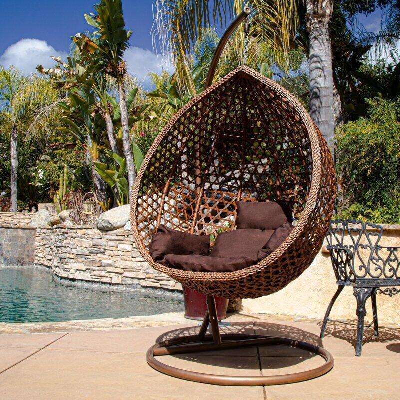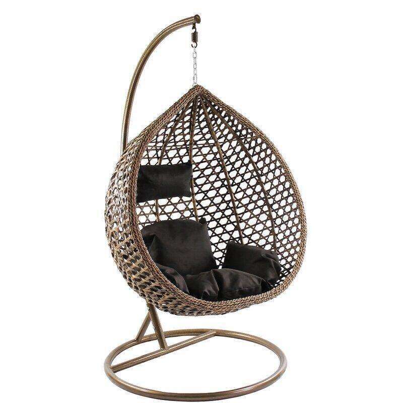 - Material, wicker plastic, steel frame, cotton mat, easy assemble. Built from thick brown meshed wicker, this chair will have you cradled and hanging in comfort as you enjoy the refreshing breeze of the great outdoors. From summer lounging to stretching out with a good book, this hanging basket chair will have you relaxing with ease.