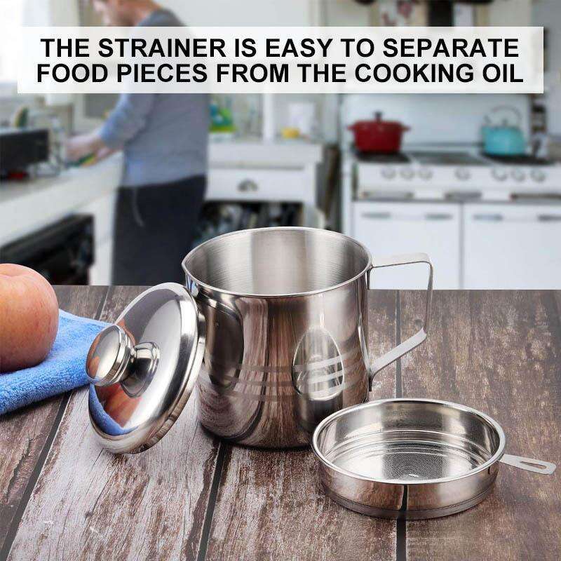 Use the hidden strainer as a separator for all the particles and the little spout to help with pouring. The lid fits over the mesh screen and canister for a clean looking dispenser. Using this metal jar allows you to wash the fryer without throwing away the oil each time.