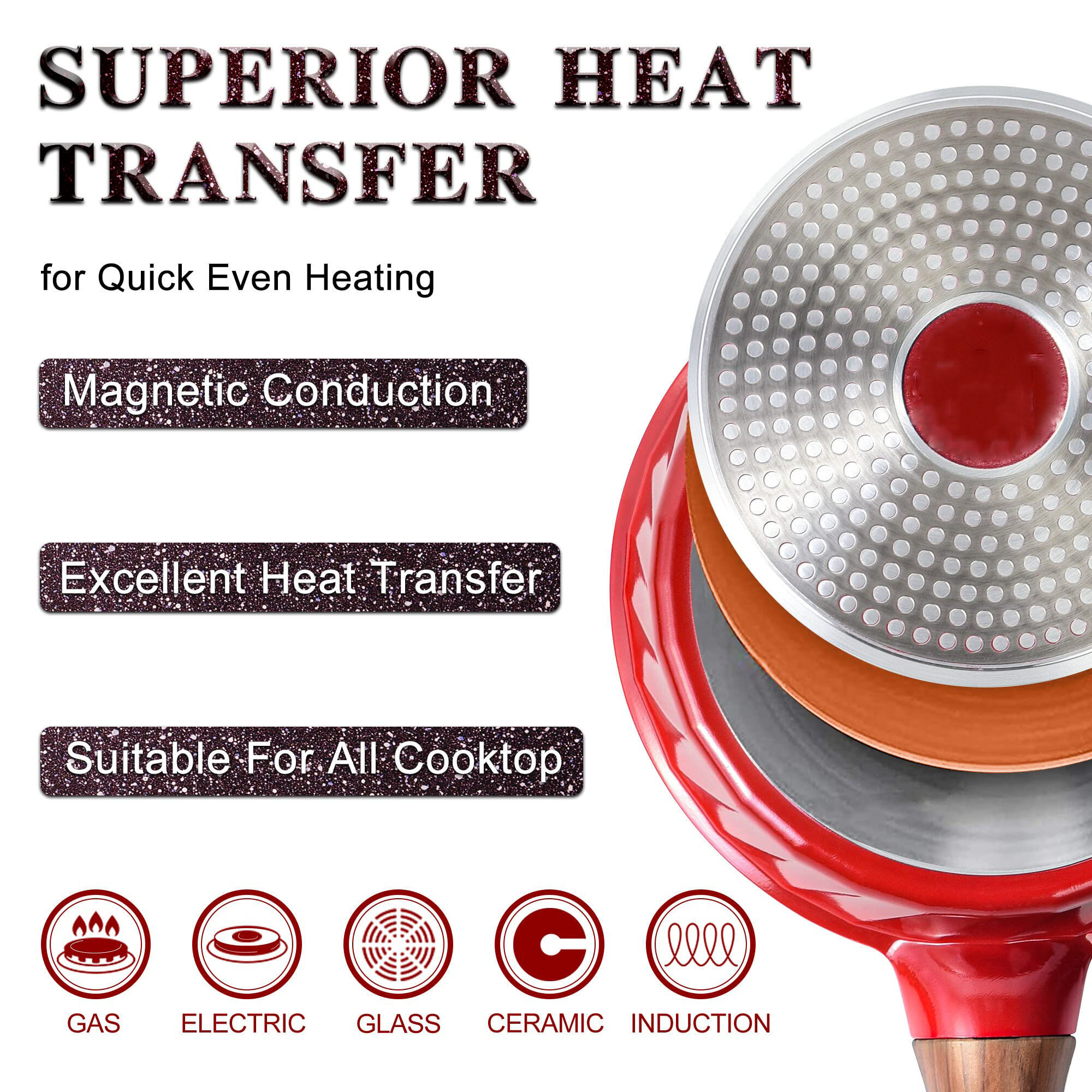 - ¡¾Easy To Clean Cookware Set¡¿- With the non-stick coating, there are no more sticky or difficult-to-clean problems. Only by using a soft sponge or dishcloth, you can clear oil stains easily. Please do not use a sharp or pointy brush, which would do harm to the non-stick layer.