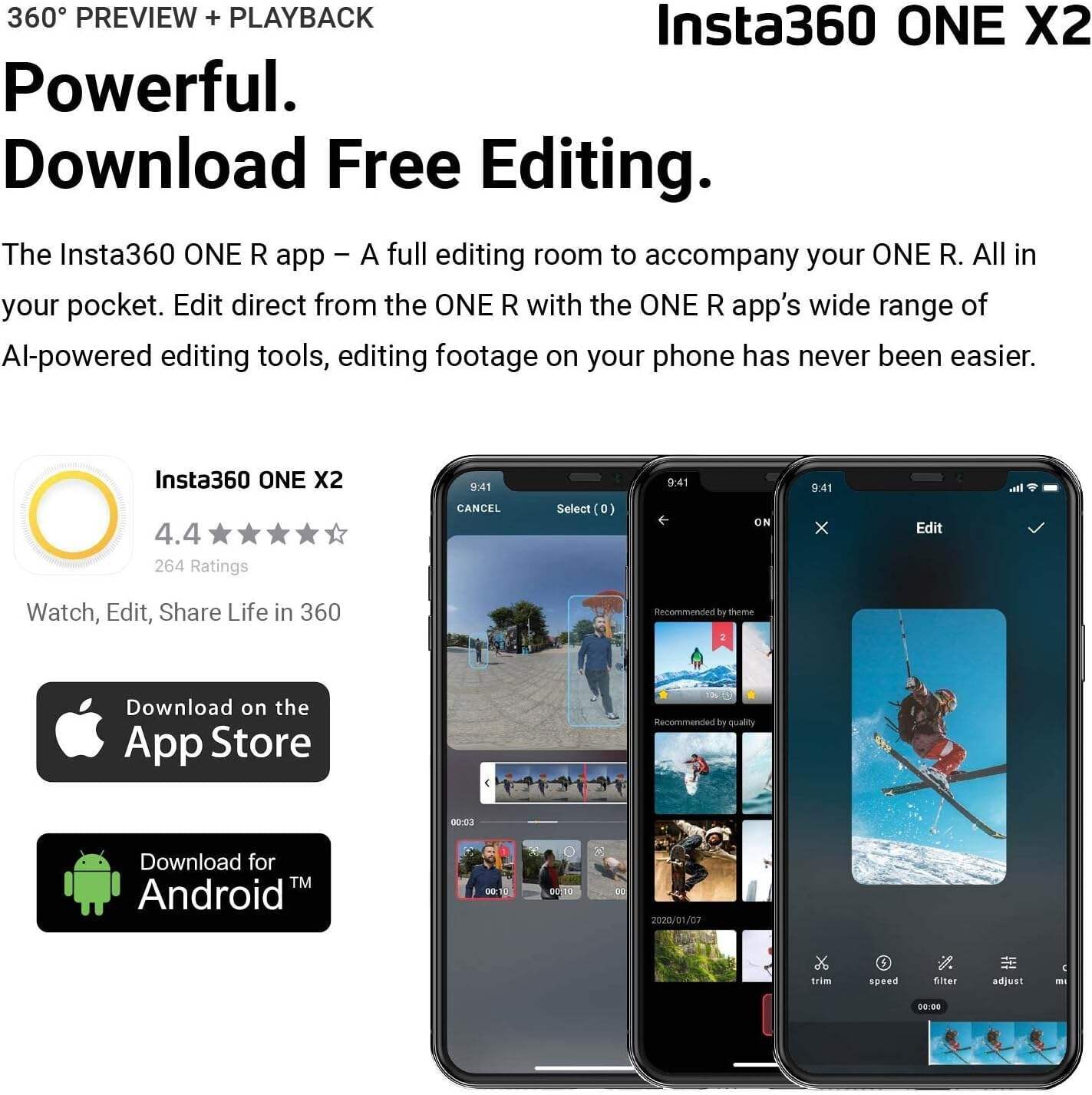 - POWERFUL DOWNLOAD FREE EDITING: With 360° preview & playback, the Insta360 ONE X2 app is truly a game changer - a full editing room that allows you to EDIT DIRECTLY from the ONE X2 without having to download footage to your smartphone and use up precious storage space. With AI-powered editing tools, editing footage on your iOS or Android smartphone has never been easier. Be sure to check the smartphone phone recommended device list for compatibility.