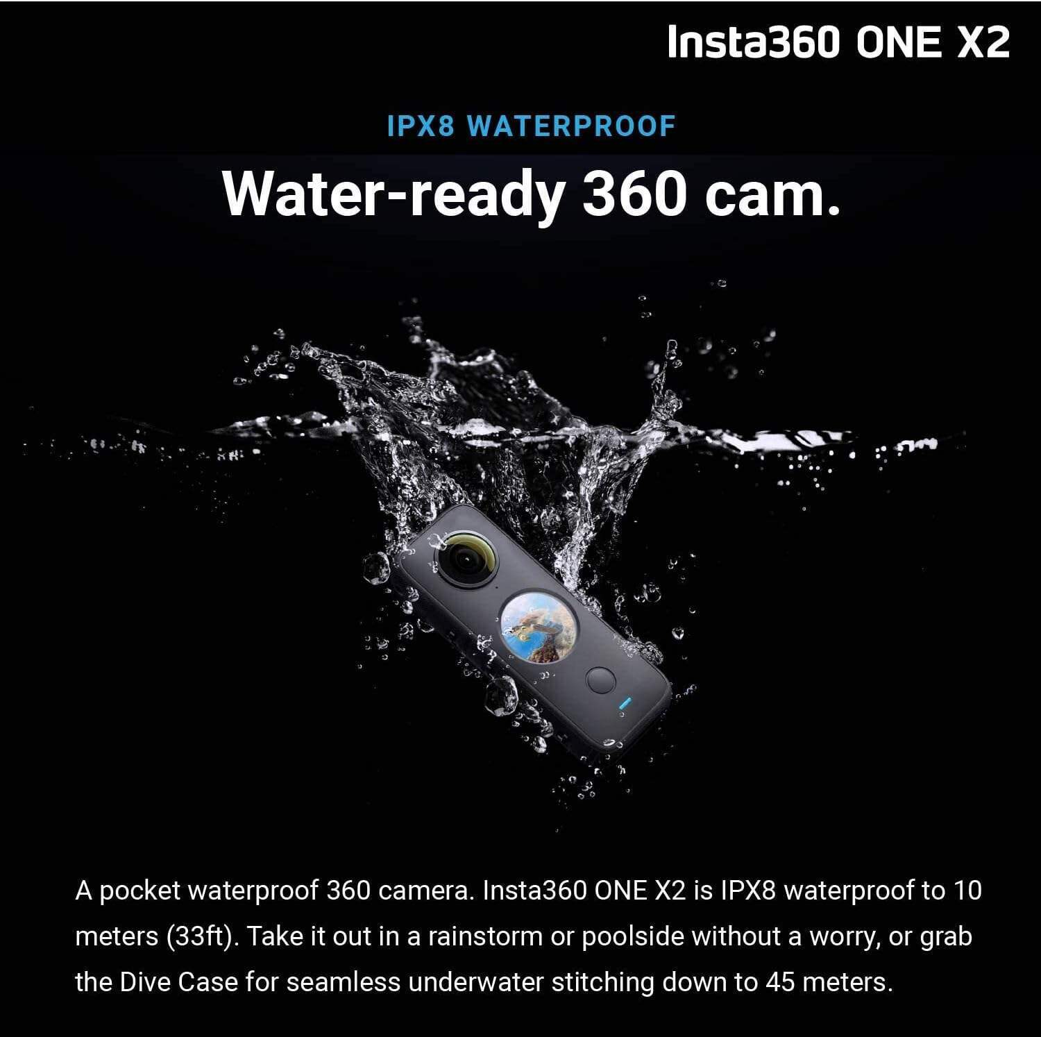 - IPX8 WATERPROOF: When fully assembled in the mounting bracket, the Insta360 ONE X2 is rated to IPX8 - waterproof up to 5 meters (16.4ft). So whether you are poolside or out on a rainy-day ride, the ONE X2 can handle it. Optional dive cases for the dual-lens 360 Mod (up to 30m) and 4K Mod (up to 60m) are available and sold separate.