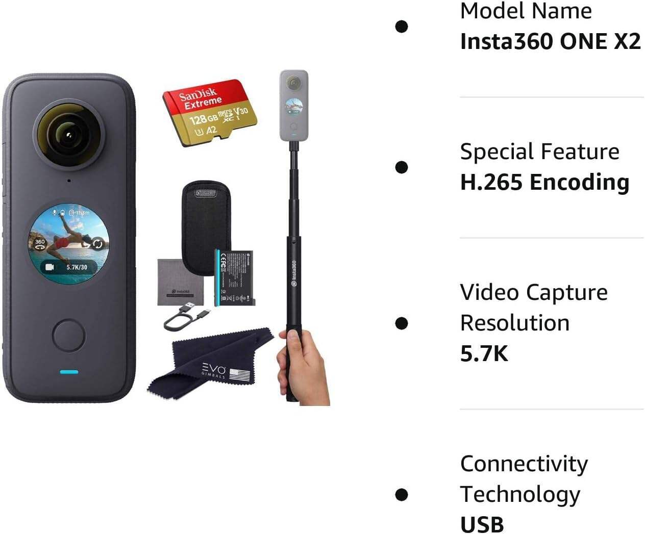 - IN THE BOX: x1 - Insta360 ONE X2 360 Camera, x1 - Insta360 Invisible Selfie Stick 120cm (long version), x1 - 1630mAh Battery, x1 - 128GB Extreme microSDXC V30 Memory Card, x1 - Charging Cable (USB), x1 - Protective Pouch, x1 - Warranty Card, x1 - Quickstart Guide & x1 - EVO Gimbals Microfiber Cleaning Cloth