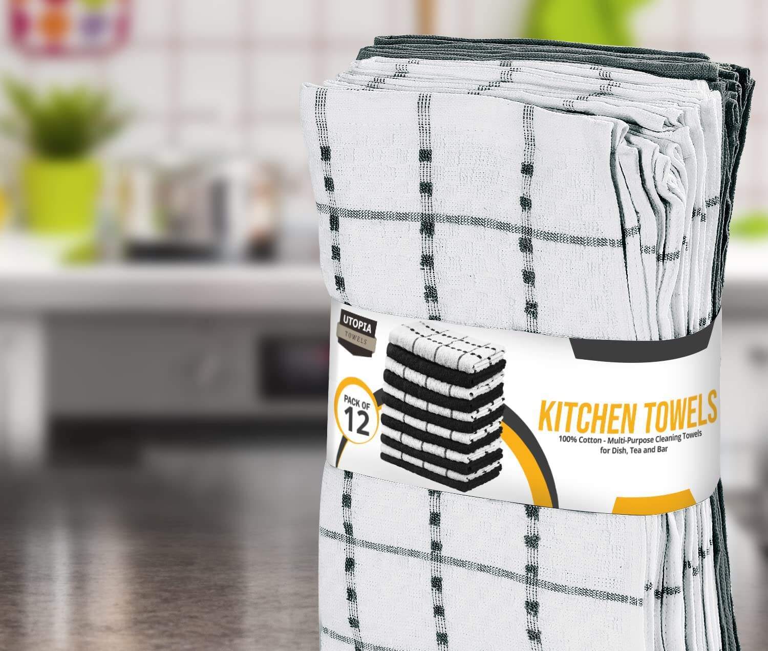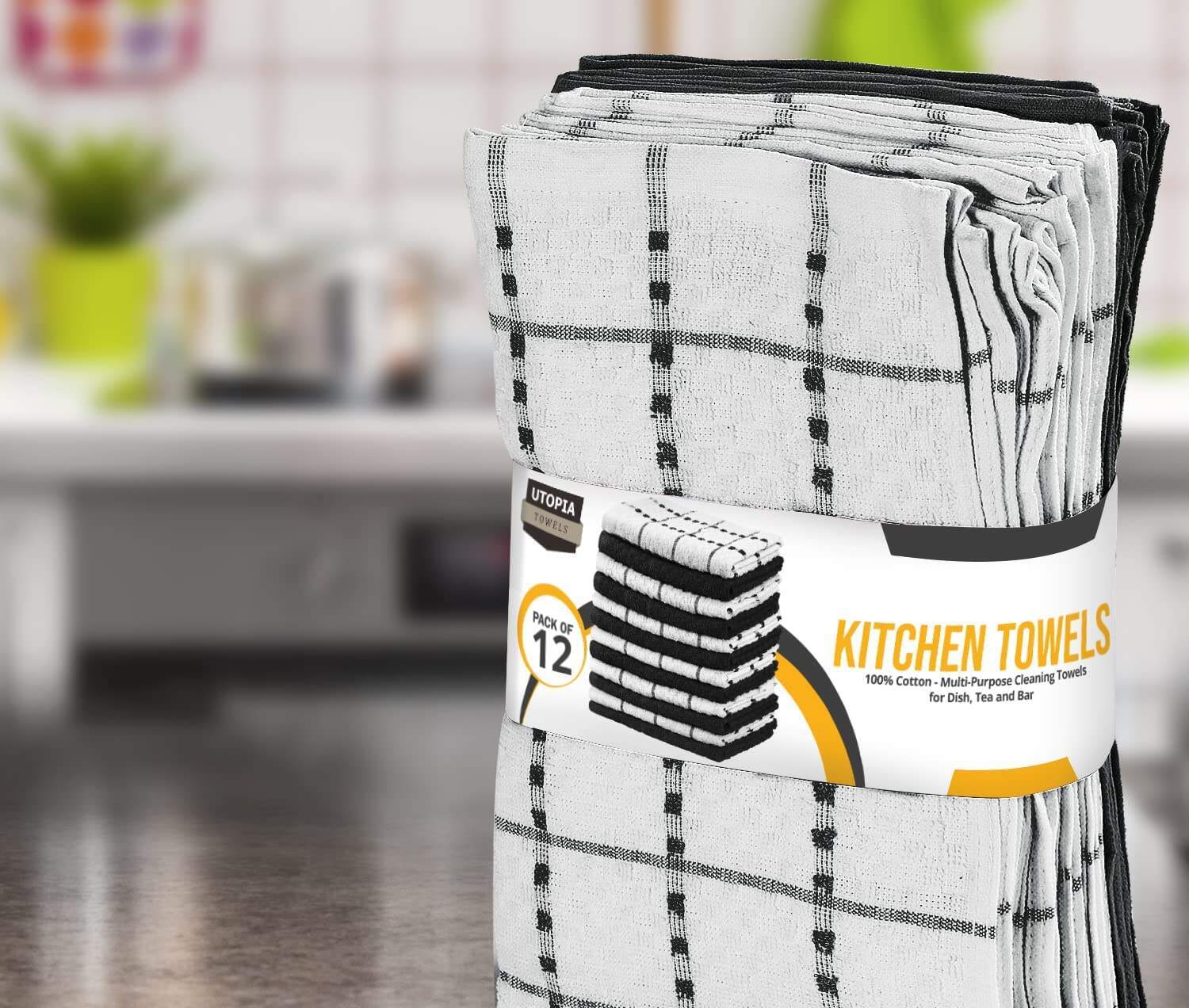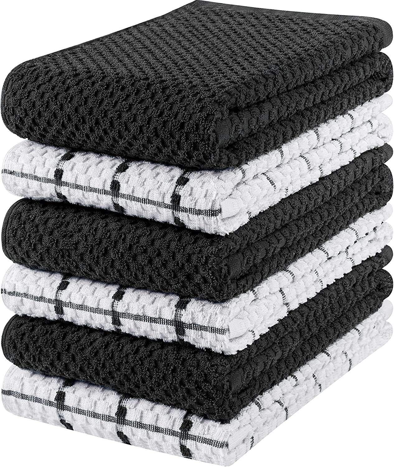 - VALUE PACK- Set includes 12 cotton dish towels with six black and six white dobby weave style kitchen towels measuring 15 x 25 inches