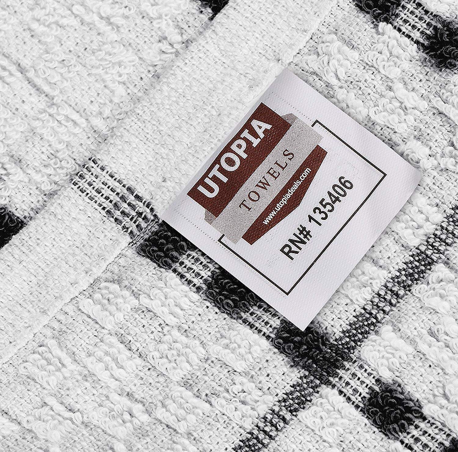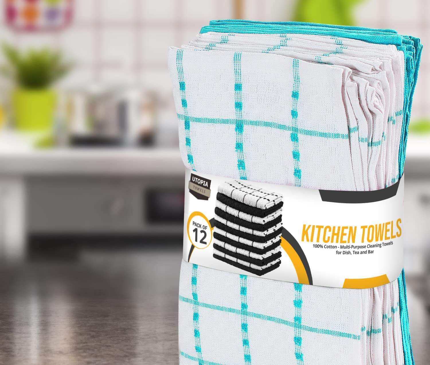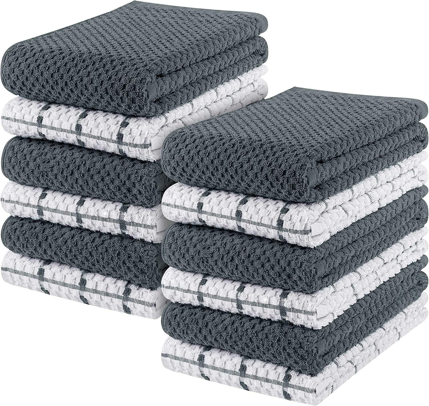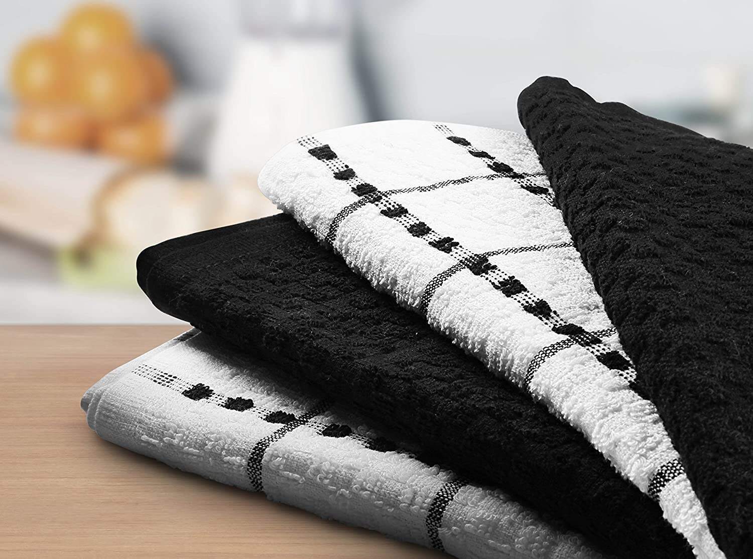 - VALUE PACK- Set includes 12 cotton dish towels with six black and six white dobby weave style kitchen towels measuring 15 x 25 inches