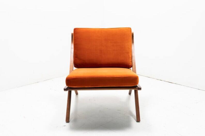 Our Folke Ohlsson inspired scissor chair is an iconic mid century silhouette. The chair is made of walnut that is finished with a natural oil and custom made to order in your choice of fabrics.