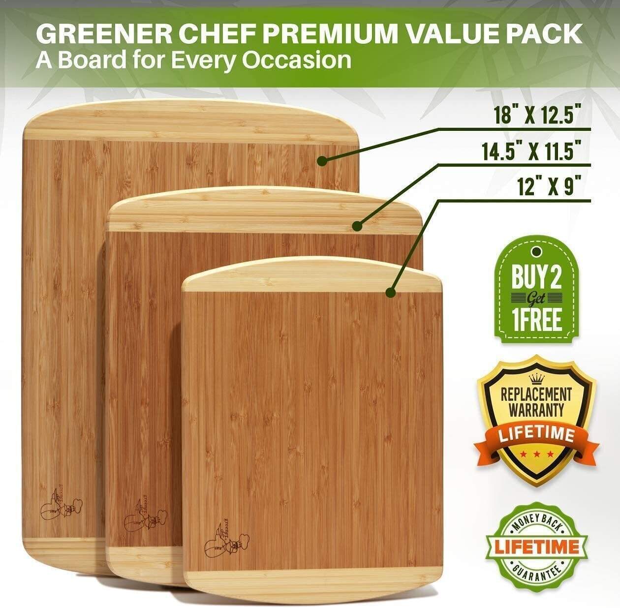LIFETIME WARRANTY - MONEY BACK GUARANTEE a The last bamboo cutting board set youa ll ever need, guaranteed, in 3 a Just the Right Sizesa ; 1 Extra Large Bamboo Cutting Board (18 x 12.5", 3.5lbs) 1 Medium Sustainable Bamboo Wood Cutting Board (14.5 x 11.5", 2lbs) and 1 Small Wooden Cutting Board (12 x 9", 1.5lbs) to satisfy every creation & craving.