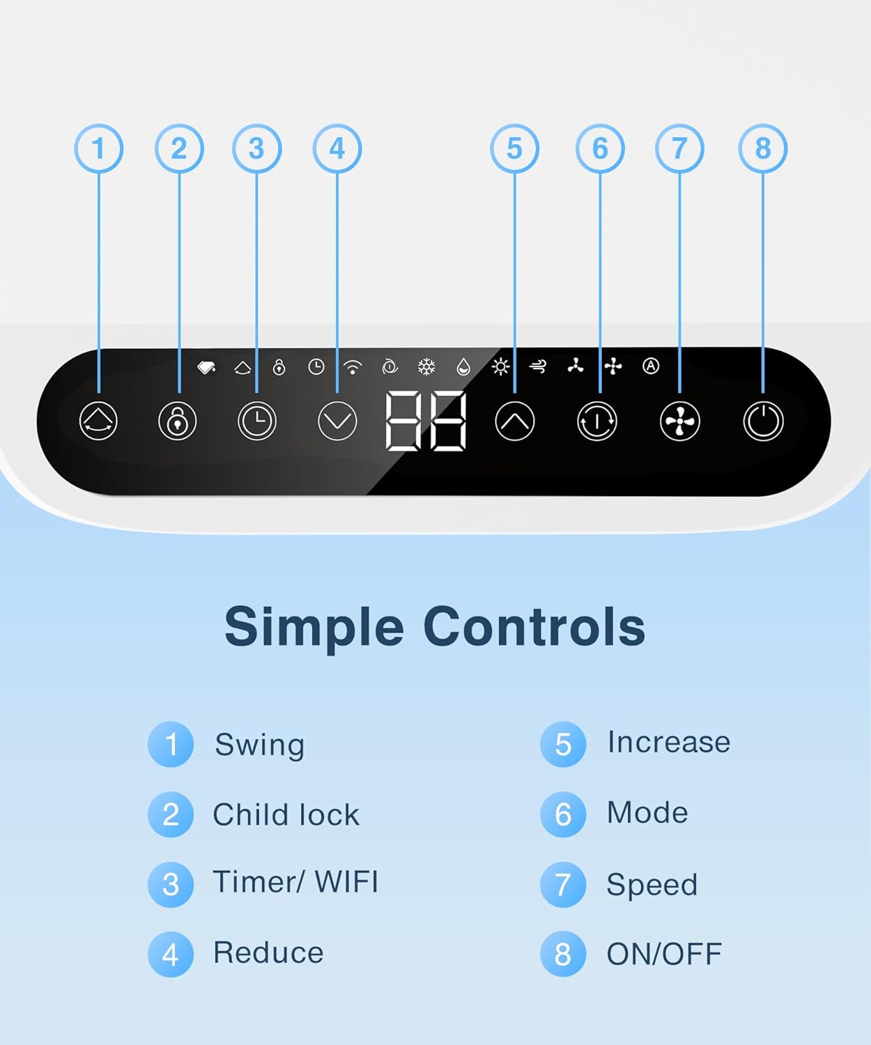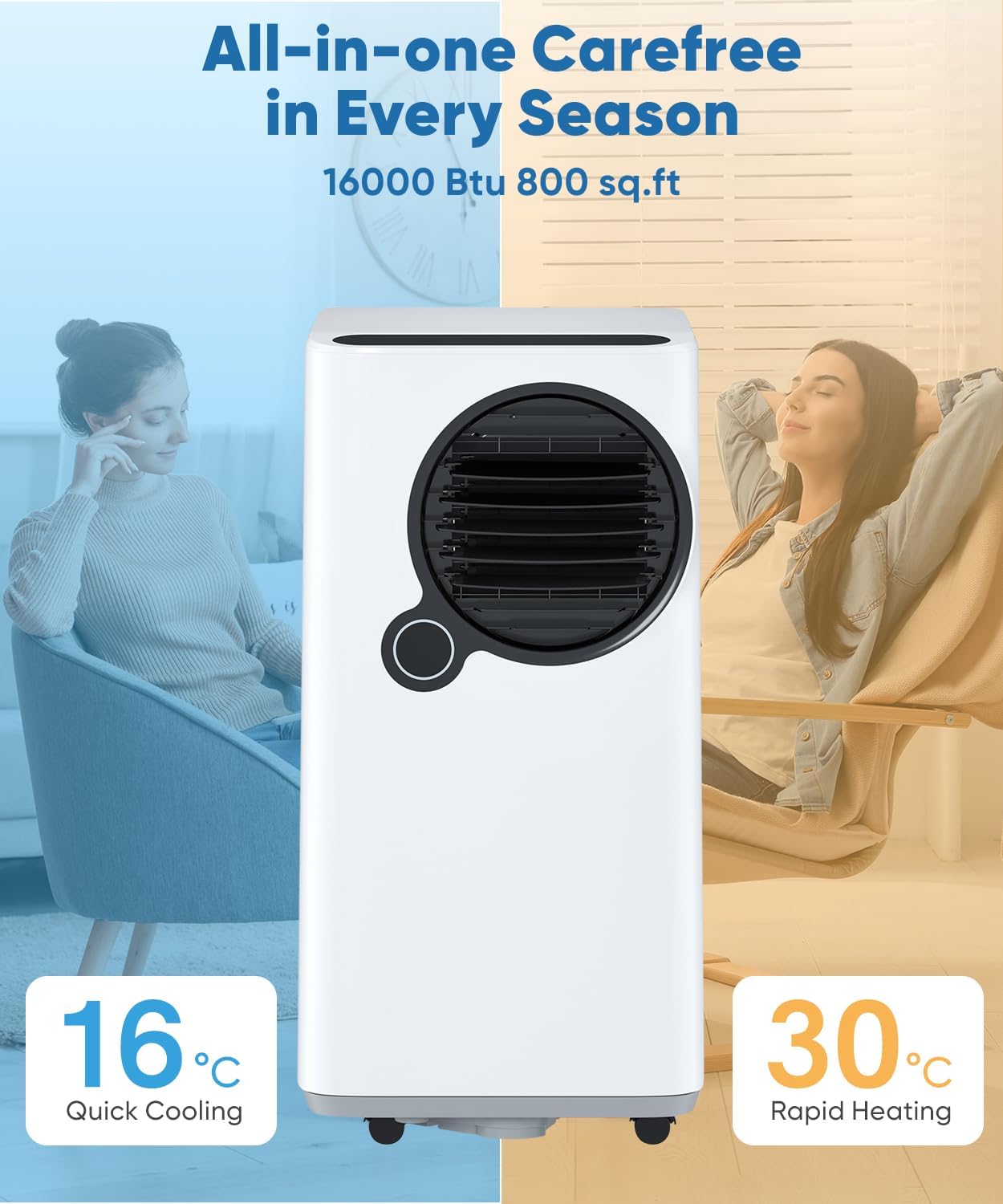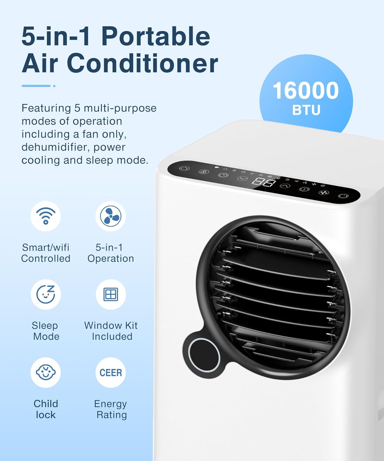 - 5-in-1: Our 16000 BTU portable air conditioner Wifi App Control Cooling & Dehumidifier/Fan/Heat/Auto Swing/Sleep/24H Timer Remote Window Kit Included top mounted control panel with LED display.