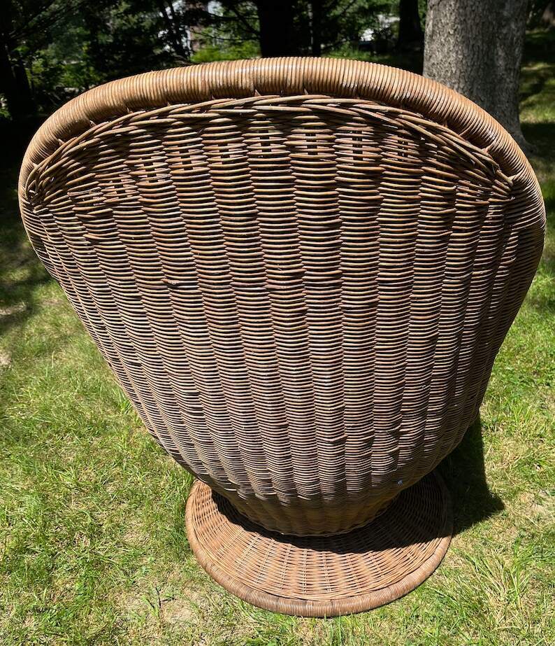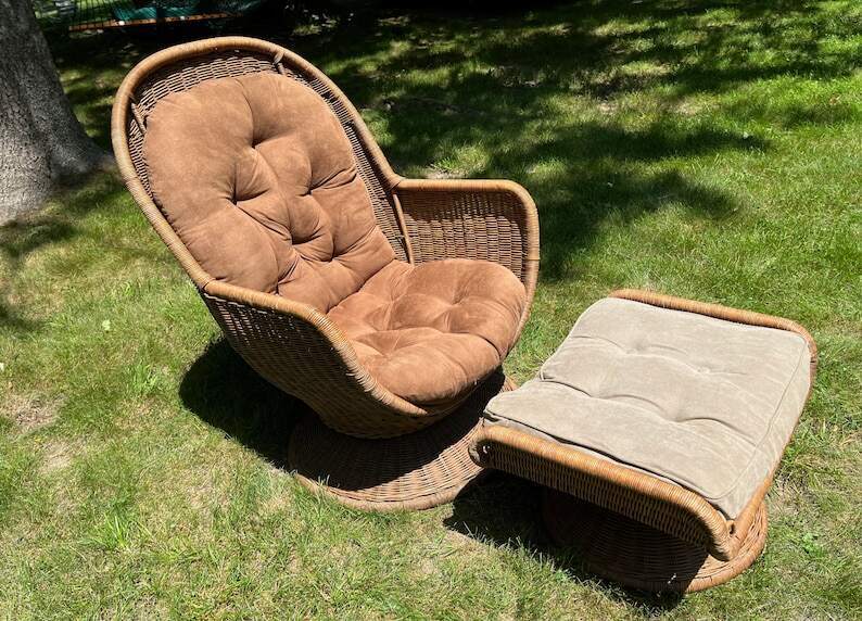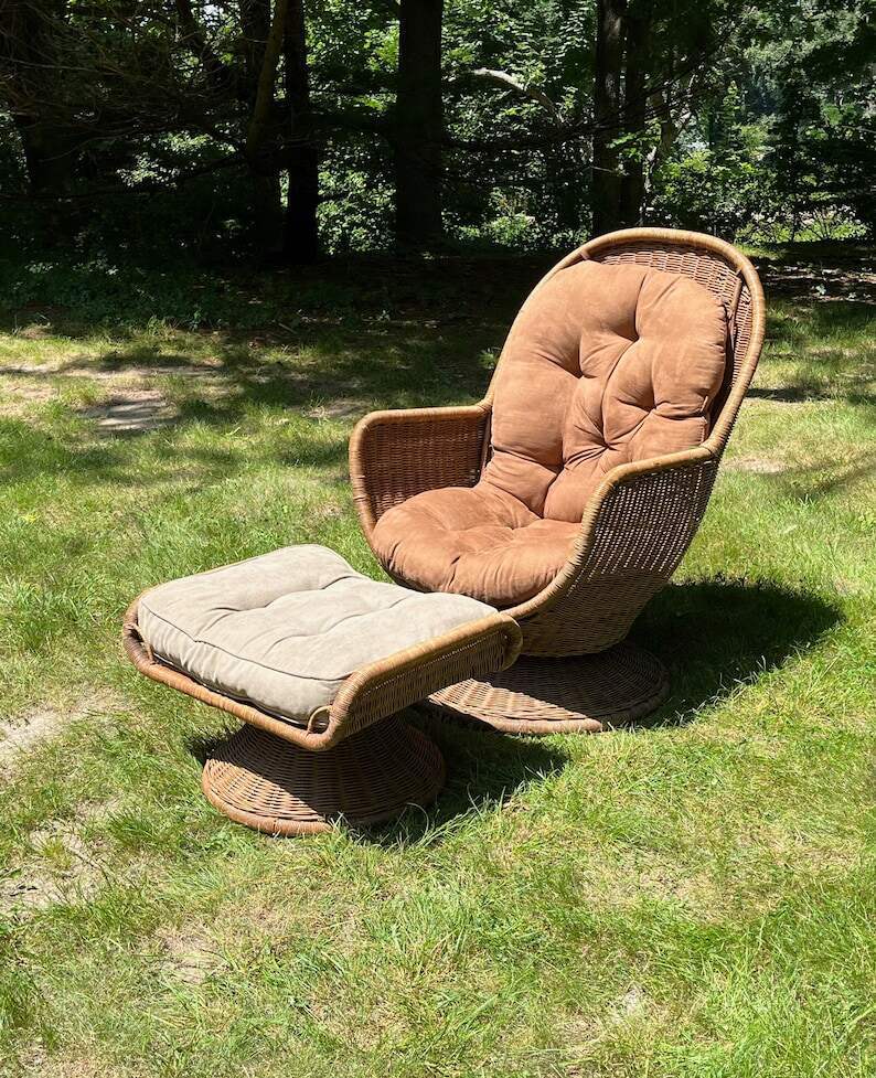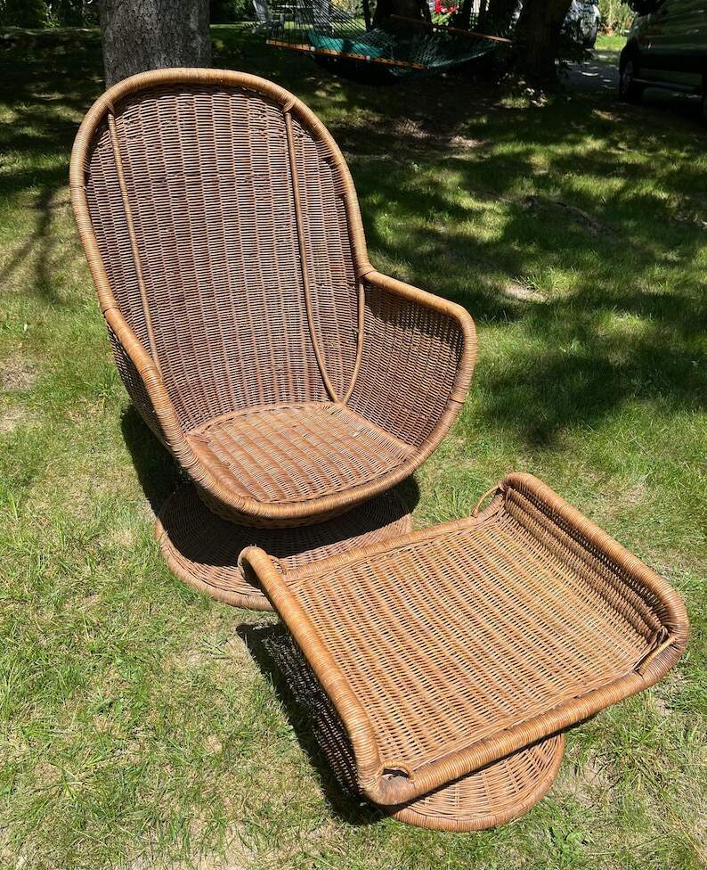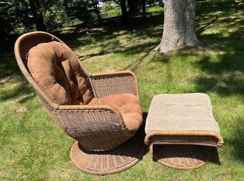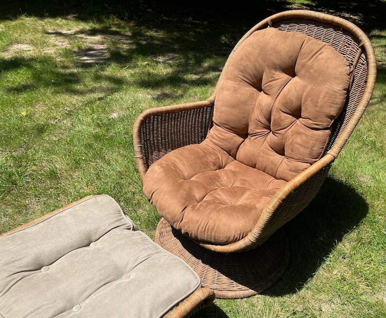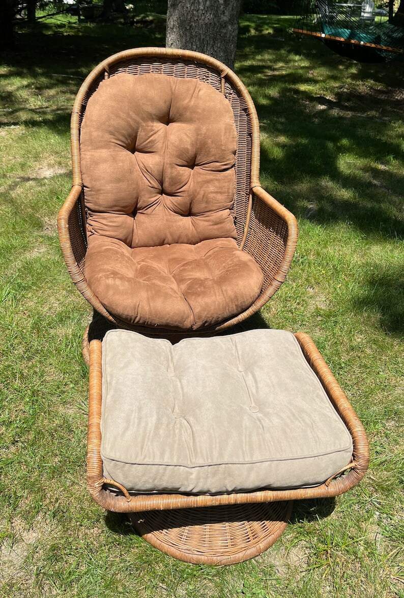 Savor your summer as you lounge on your veranda or lanai and for the cooler months enjoy the cozy comfort of this Boho Chic chair and ottoman. Mid Century Modern, coastal decor. Hand woven rattan in its natural color, it swivels and tilts. There are tufted cushions of different colors, beige and brown. Both are in excellent condition, very well constructed, with period wear and patina consistent with age and use, but no serious damage or repairs.