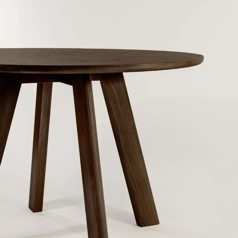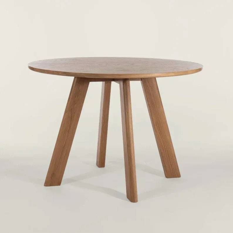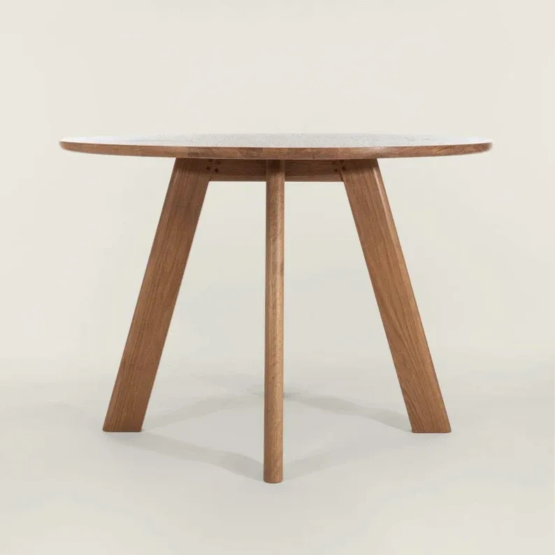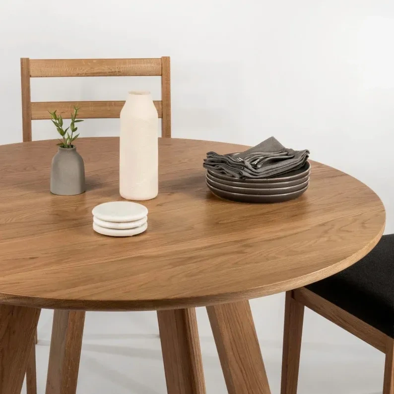 Round dining table made from solid wood, premium American oak. Designed with elements of Scandinavian and contemporary aesthetics, inspired by the minimalist Japanese concept of Ma.