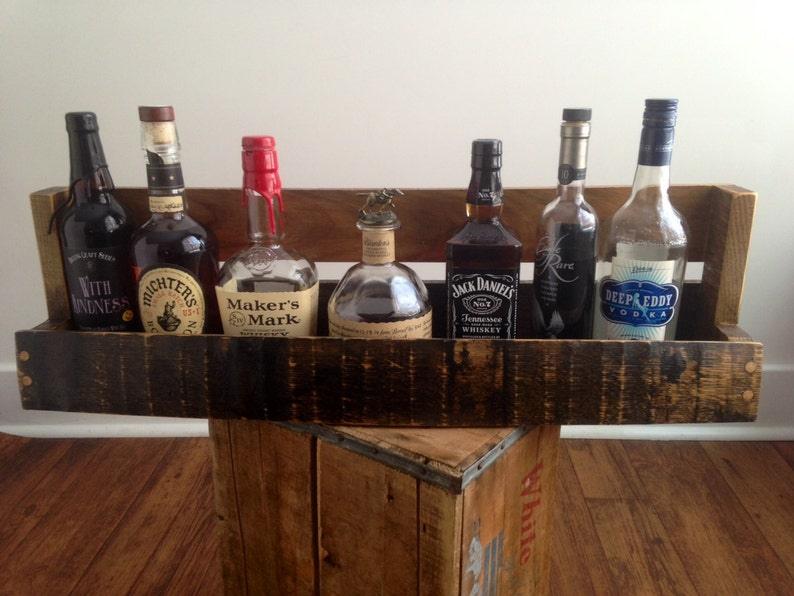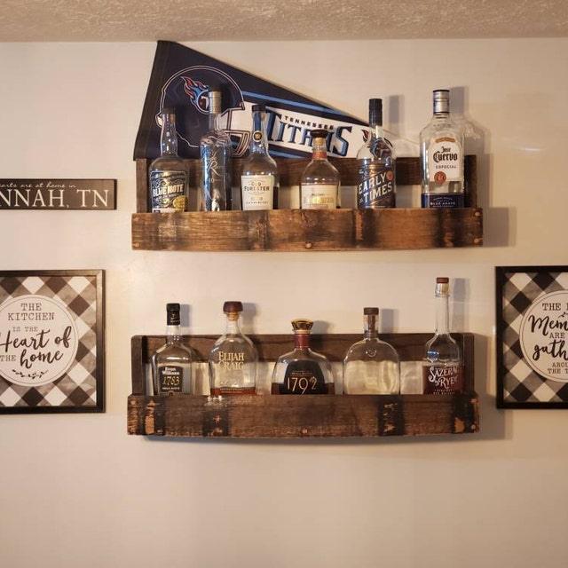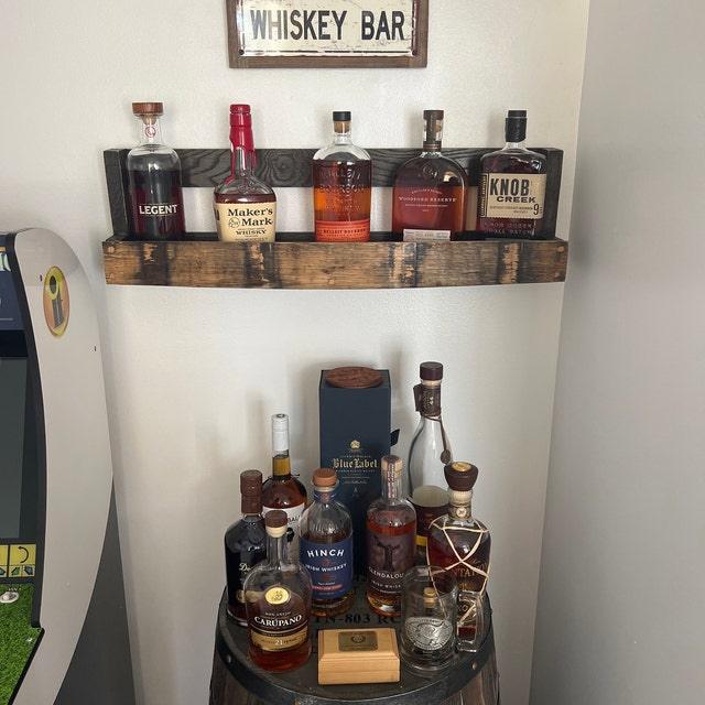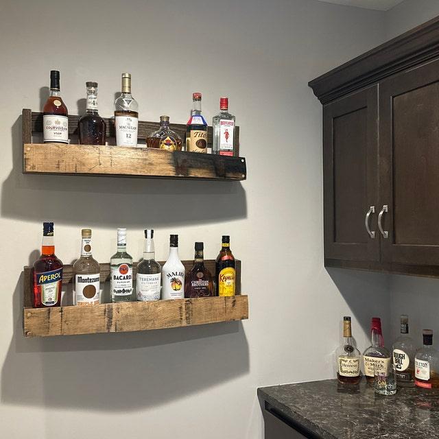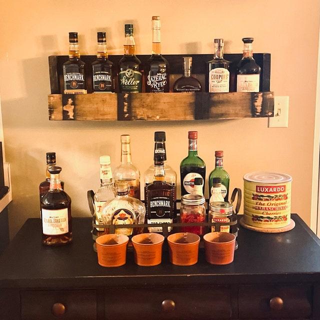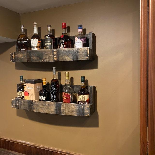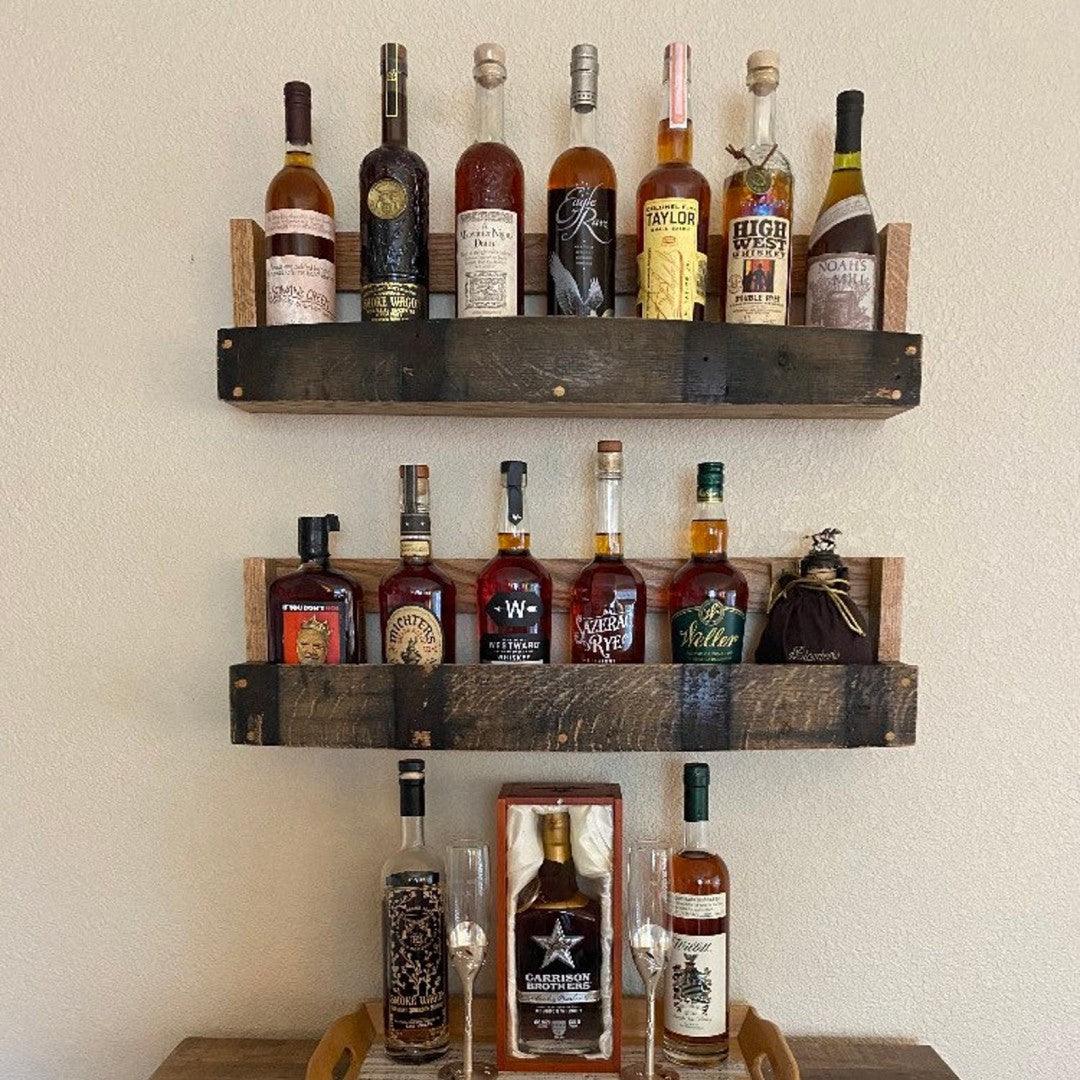 This is such a beautiful shelf with amazing craftsmanship.Perfect for your bourbon collection.