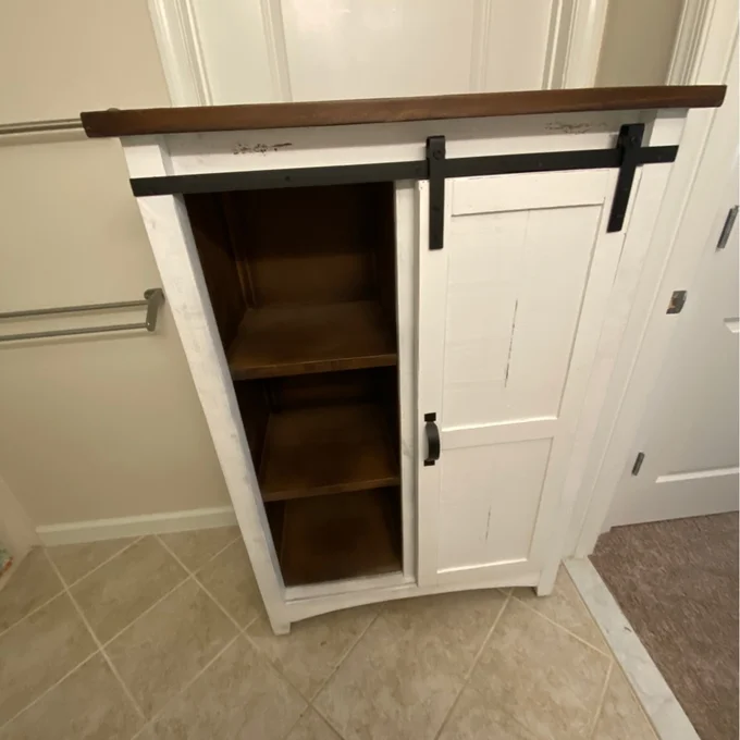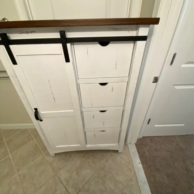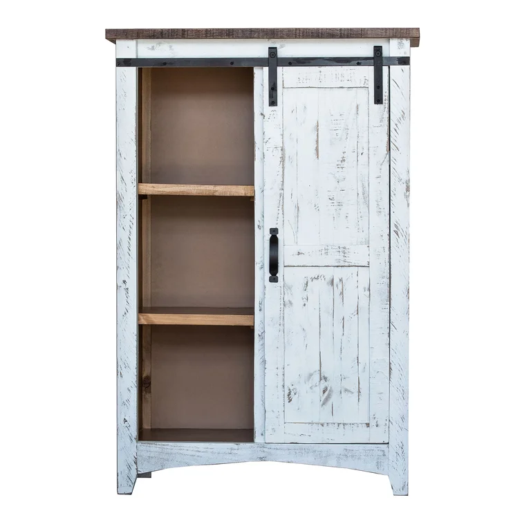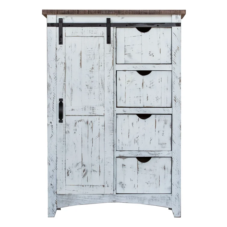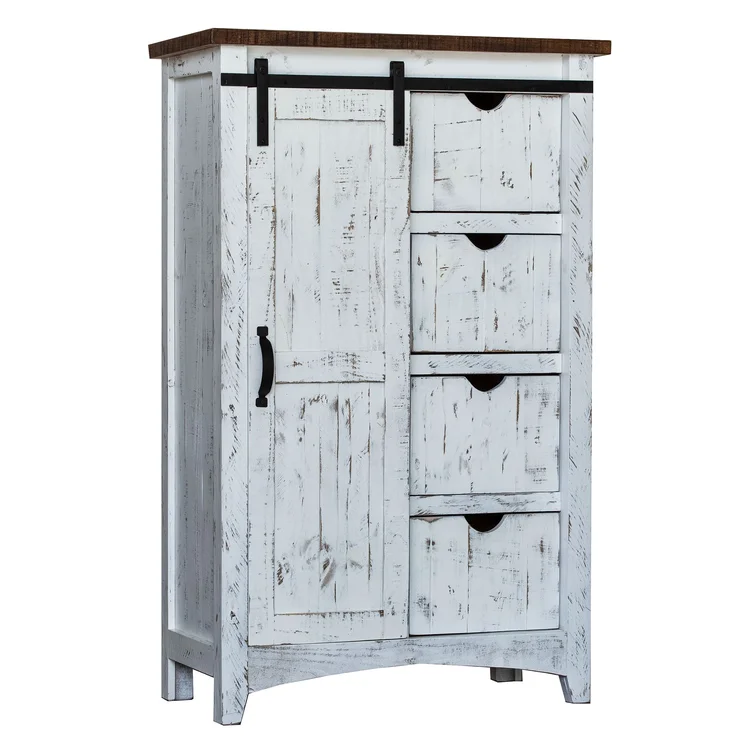 Features a barn styled door and four open shelves behind the door for storing your favorite clothing or your linens. -Includes Four Drawers and One Cabinet -Three Shelves Behind Cabinet -Barn Doors -Black Metal Accents -Constructed of Hardwood Solids, MDF, & Plywood -Distressed Markings -Brown Top