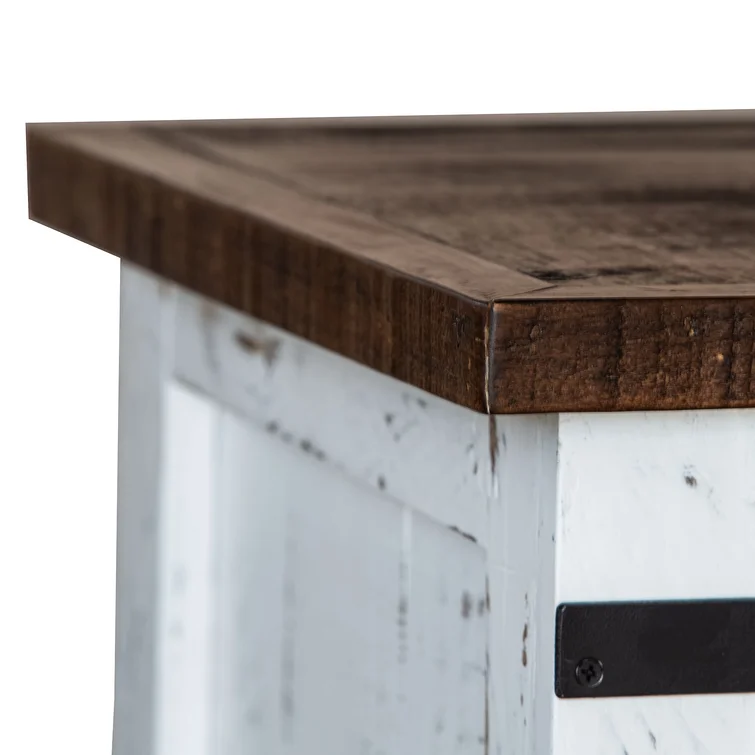 Finished in white lacquer with distressed markings throughout wood for antique appeal. The top features a brown finish for rustic aesthetic that blends well with a variety of home themes.