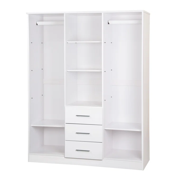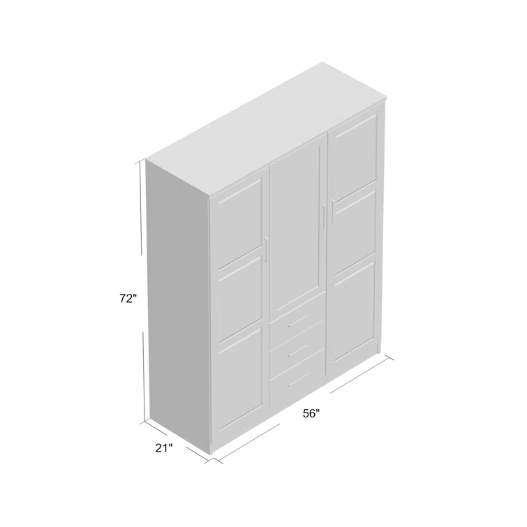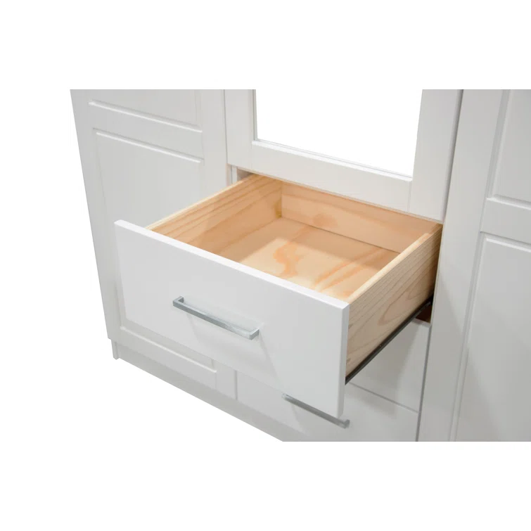 In need of more storage? This modern armoire gives you extra space for all your favorite things. Its frame is made from solid pine wood in a crisp, versatile finish that goes with everything! A mirrored door in the middle gives you a convenient spot to check out your look and open up your room. It opens up to three open and adjustable shelves and a hanging rod that can house hats, sweaters, and ties. Two side compartments with carved accents have clothing rods at the very top to hang dresses, blazers, and long coats. Plus, three drawers open up on roller glides, allowing you to tuck away socks and delicates.