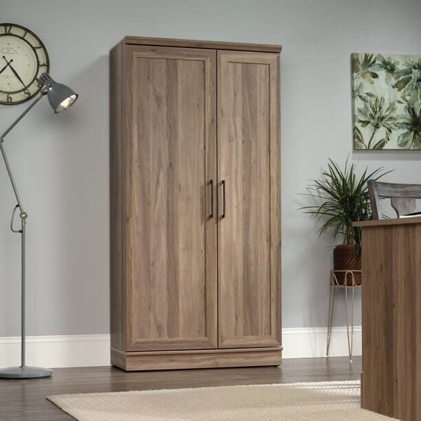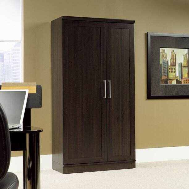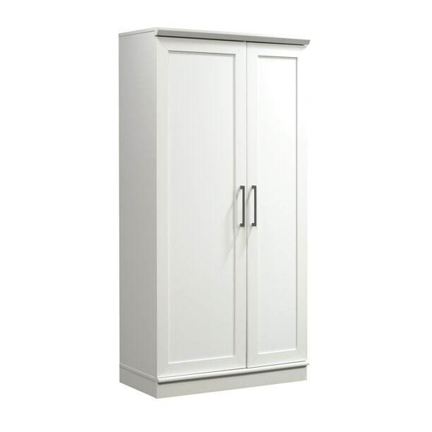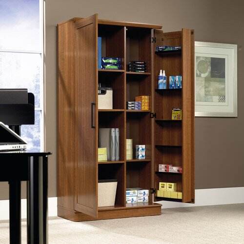 - Two adjustable shelves and one fixed shelf sit behind each door in our storage cabinet