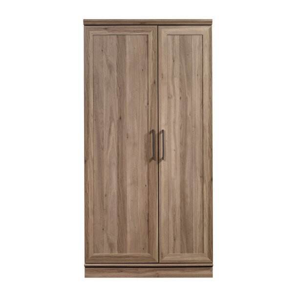 The outward opening door of this kitchen storage cabinet can be fixed on the left or right side according to your needs. Never worry about storing items that are too big or too small. Wire access through the rear panel provides a convenient path for wires. Adjustable base levelers ensure your pantry stays level, even if the floor isn't. Crafted from chic Dakota Oak, this beautiful storage cabinet is the solution to your storage needs.