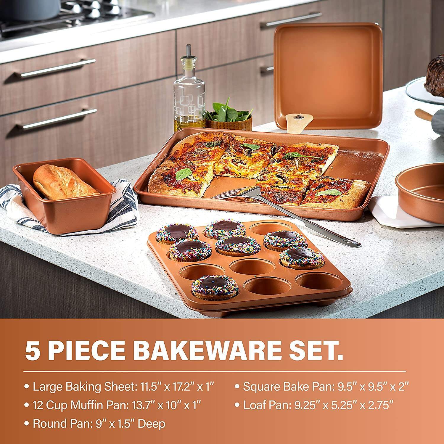 - Complete Cookware Set: This Hammered design kitchen cookware set includes everything you need to start your cooking at home while providing the perfect combination of style and effectiveness. The set comes with an 8.5"" frying pan, 10.25"" frying pan with lid, 1.5 Qt sauce pan with lid, 2.5 Qt sauce pan with lid, 5 Qt stock pot with lid, a stainless steel steamer, full sized cookie sheet, round baking pan, square baking pan, loaf pan and a muffin pan.