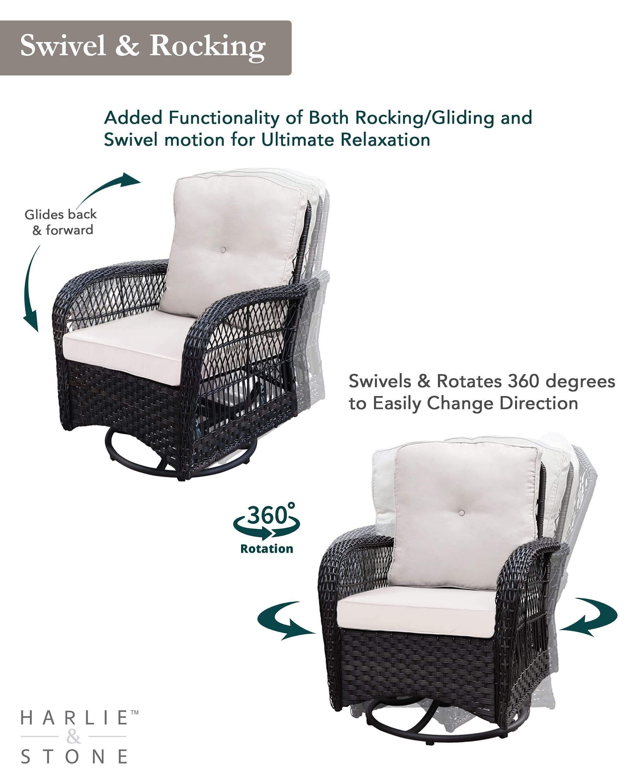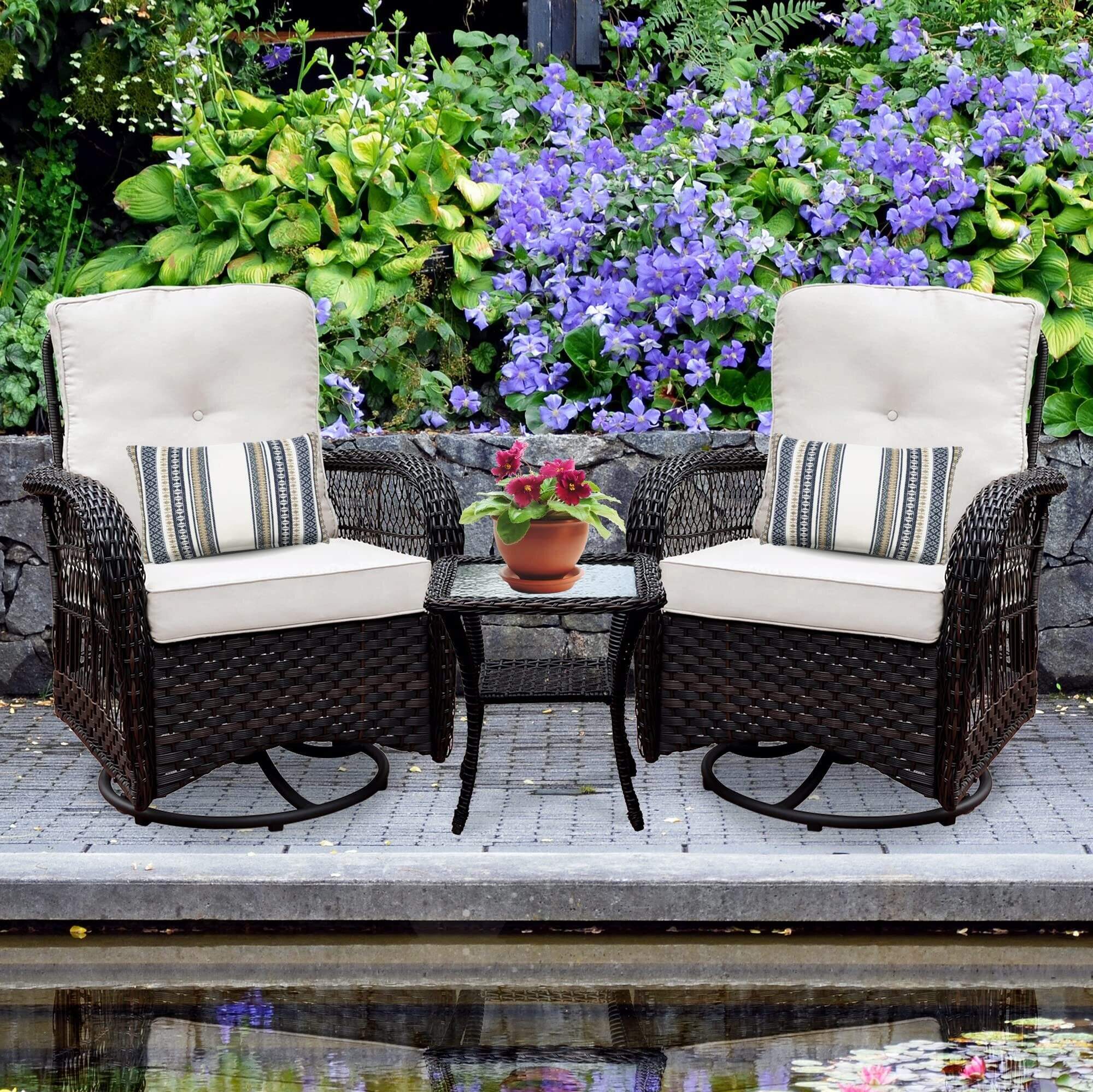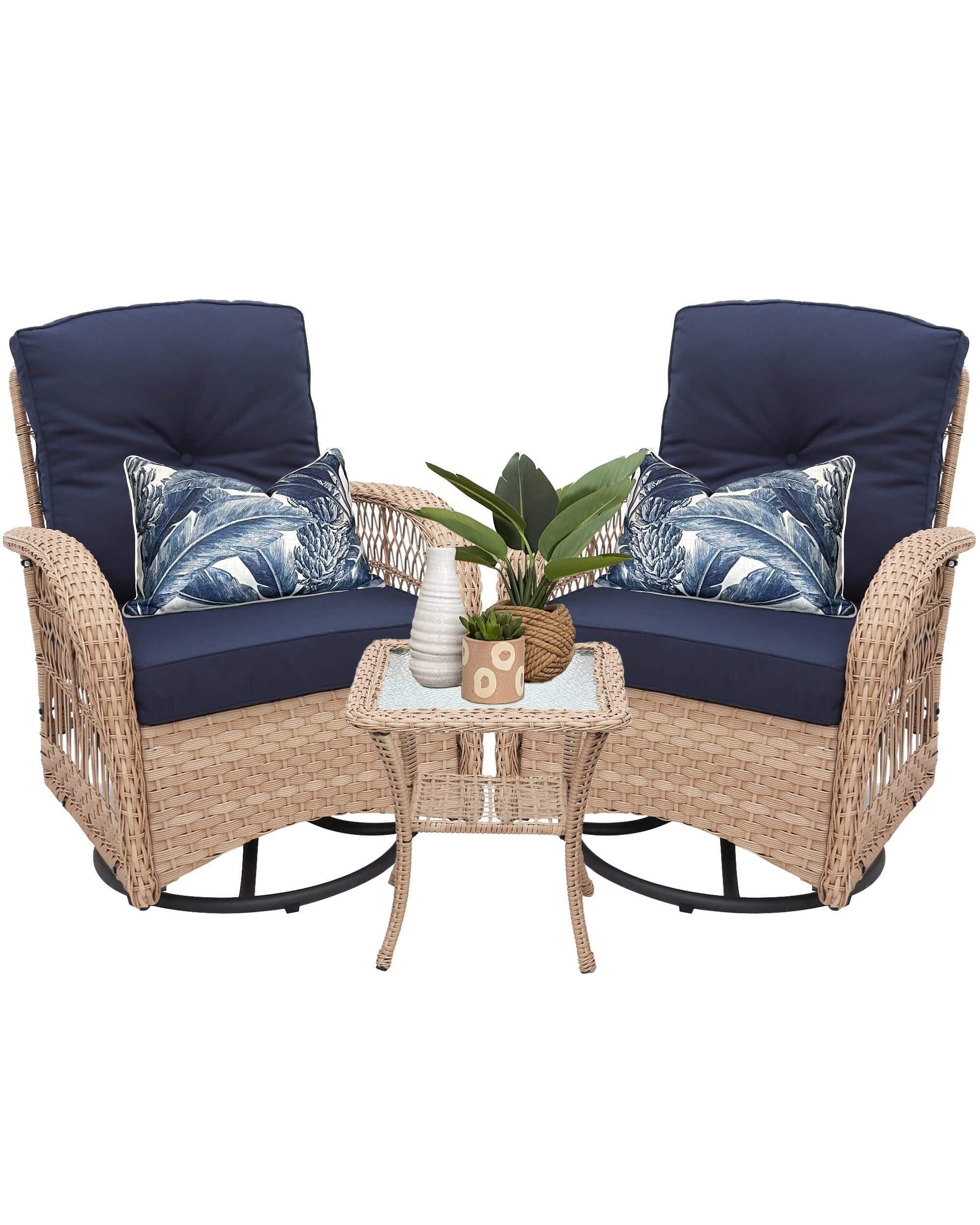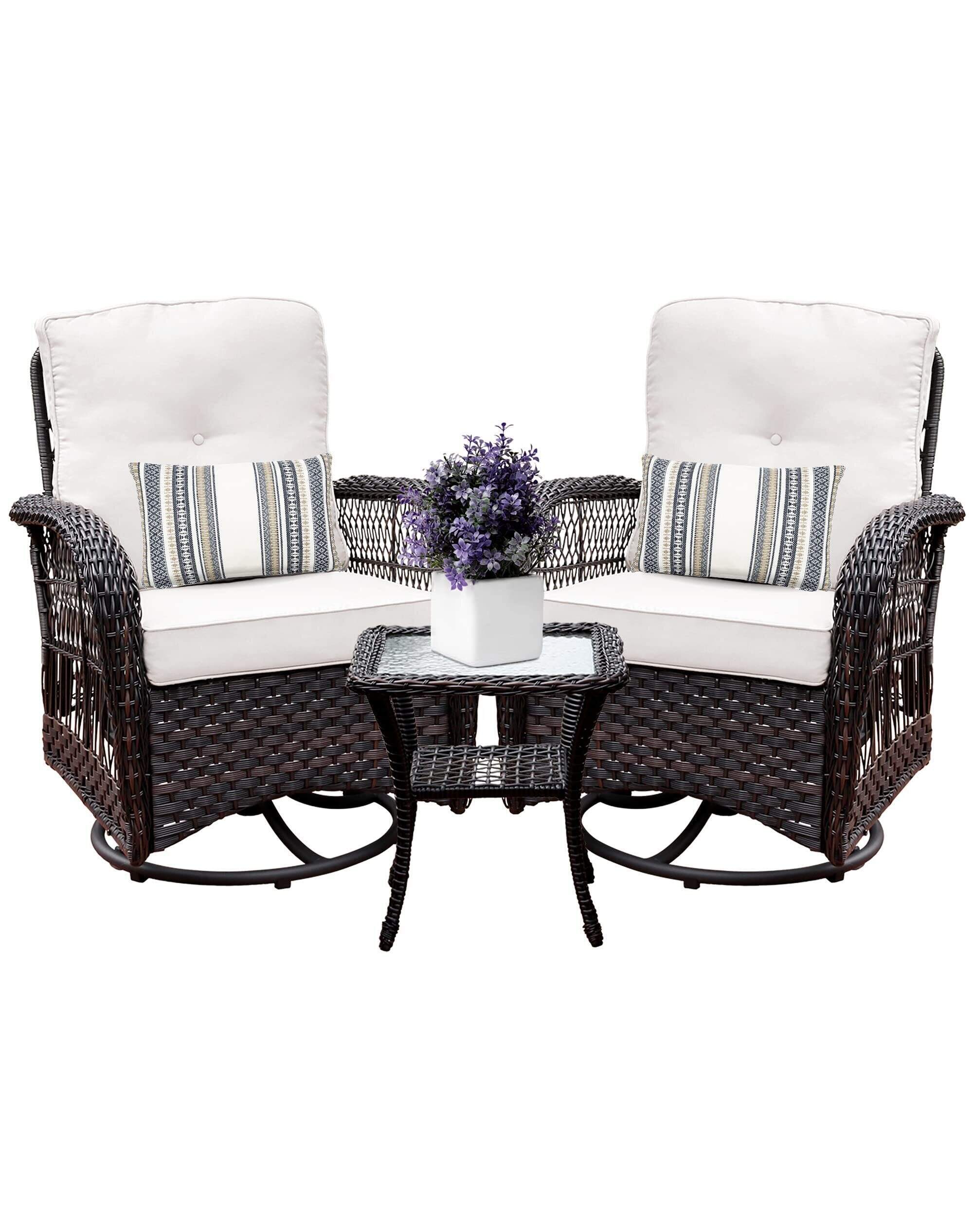 - EASY TO ASSEMBLE: Rest assured that you will have lots of help on hand while putting this outdoor swivel rocker patio chairs set together. We provide not only a clearly written, easy to follow step by step instruction manual, we also have a full instructional video which shows us putting the set together for you to follow along. This outdoor furniture set includes 2 chairs with back and seat cushions and a matching side table with tempered glass. Please note - Decorative pillows are not included with purchase.