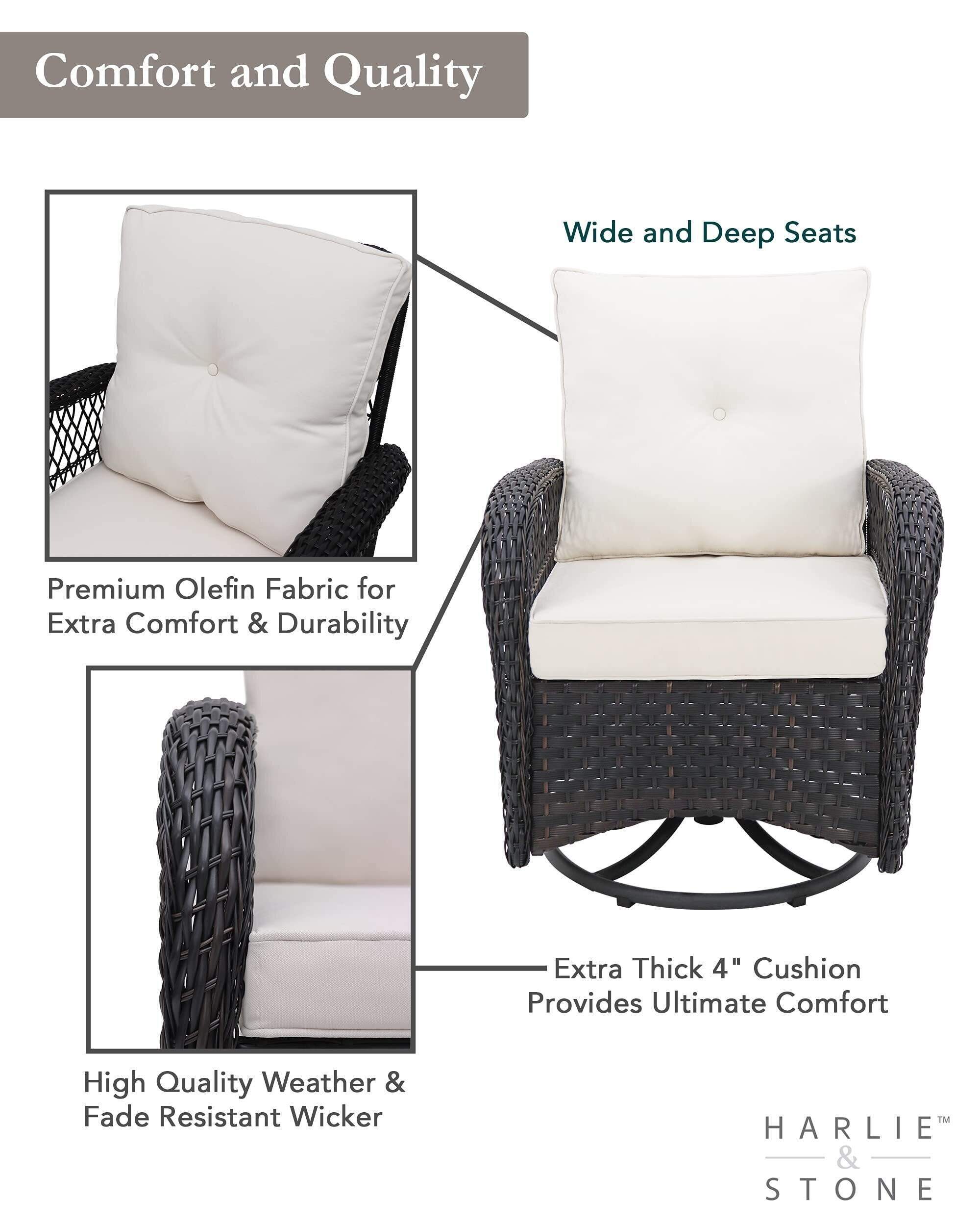 - HIGH QUALITY: We invest only in higher quality fabrics and fixtures in the construction of all of our furniture so it’s built to last. *We will not sacrifice quality for cheap supplies*. This outdoor swivel chair set is made using durable weather resistant wicker, extra Thick 4" cushions & Olefin Fabric - an upgraded fabric that’s water and fade resistant, eco-friendly and much more comfortable and durable than standard polyester fabric.