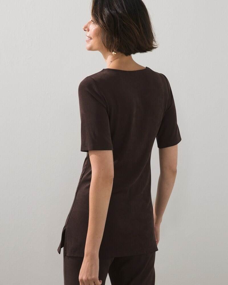 • Classic fit elbow sleeve top with a keyhole neckline.