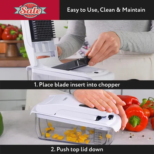 - Quality materials and easy store - our multifunctional chopper dicer comes with a space-saving blade organizer, perfect for saving space in the kitchen. The abs plastic is nontoxic and bpa free guaranteeing healthy meals for your family.
