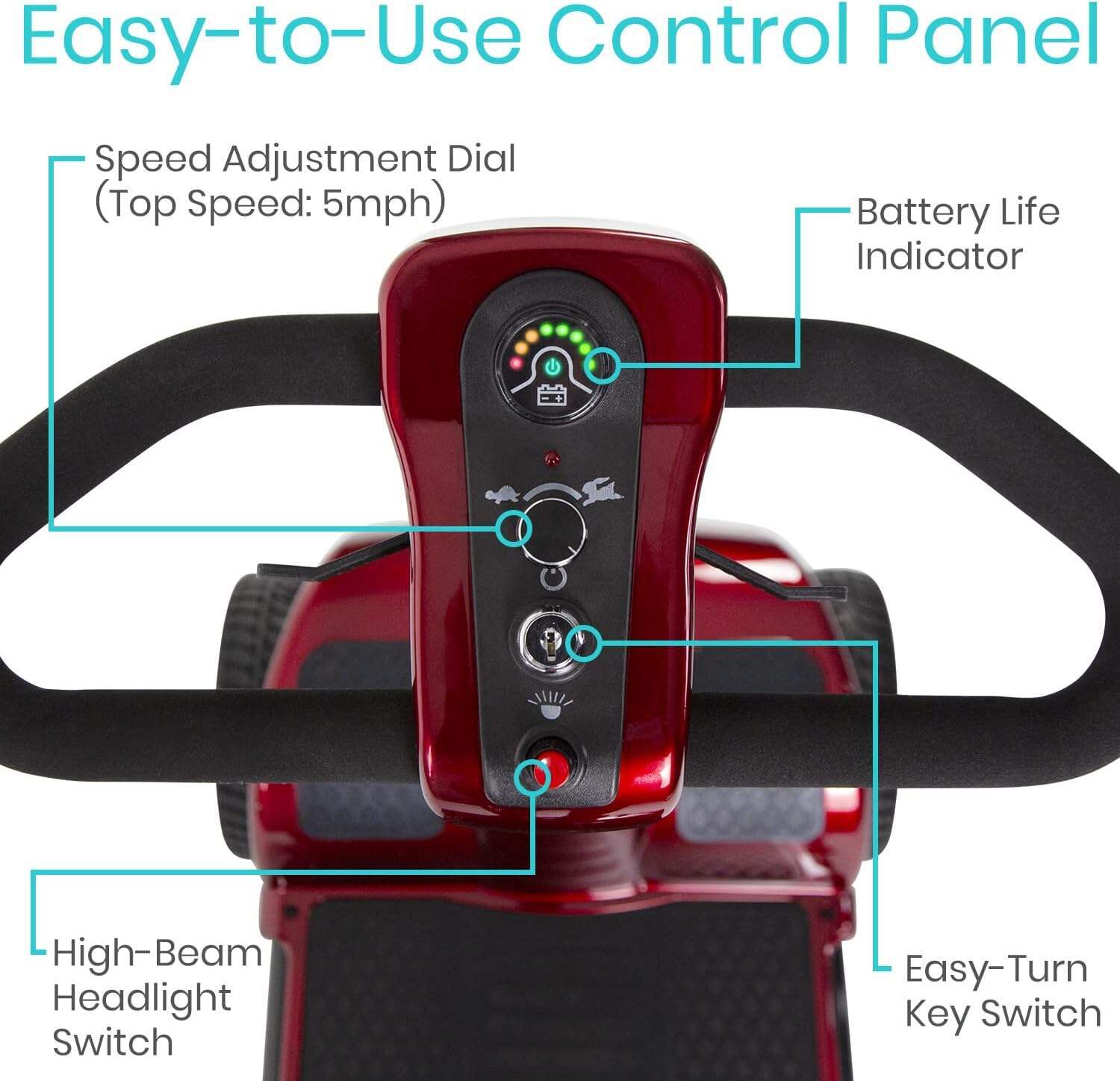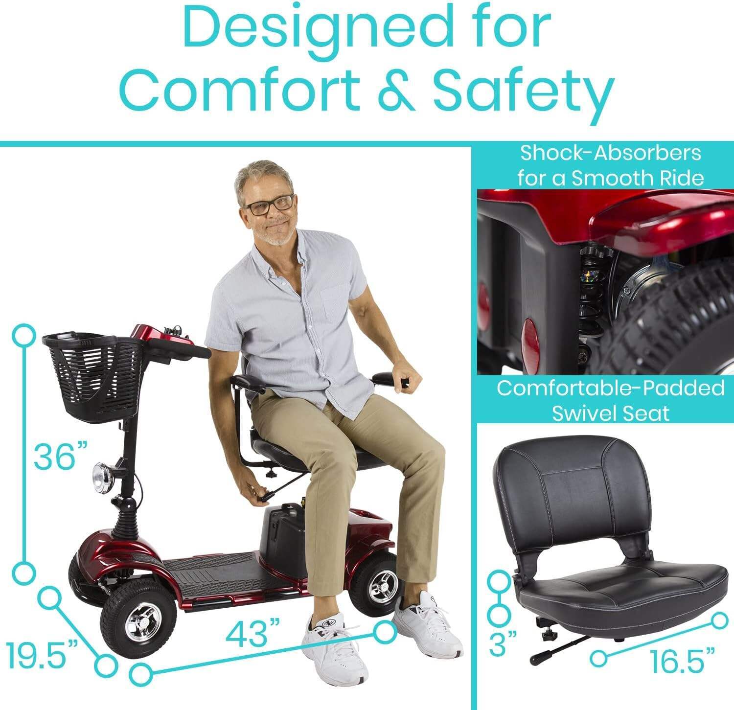 - EXPERIENCE SMOOTH & SAFE MOBILITY: Opt for the Vive Series A Mobility Electric Scooter over other scooters for its unparalleled performance and seamless ride–perfect for use at home, in markets, or on the go. With a 3.5" ground clearance and four 9" flat-free tires, the scooter easily clears door jambs and handles various flooring transitions, setting it apart from the competition.