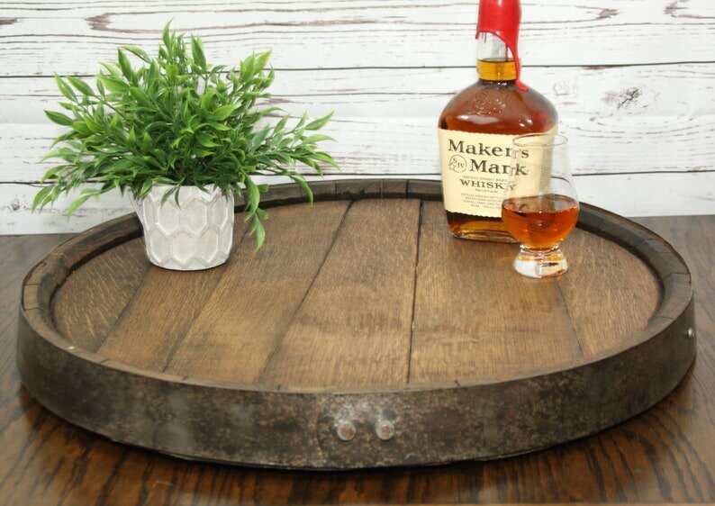 Handcrafted Lazy Susan, made from an authentic used oak whiskey barrel. Because these Lazy Susans are crafted using actual used whiskey barrels, there will always be unique variations to the look and colors of the Items. This gives them the sought after, rustic look that is unable to be duplicated. Each Lazy Susan is hand sanded, stained, and finished with a coat of polyurethane.