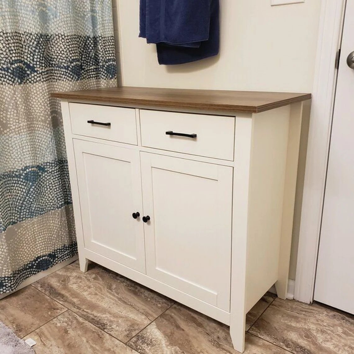 The body of our double-door double-drawer cabinet adopts ivory white lacquer, which greatly improves the texture of the product. The top of the wood grain finish is pasted with triamine, which is scratch-resistant. The classic black handles and knobs add an industrial touch to it, making it versatile in any home decor. The 35.8" wide and 32.3" high entryway cabinets are ideal for placement in various places such as the dining room, living room, entryway, and bedroom.